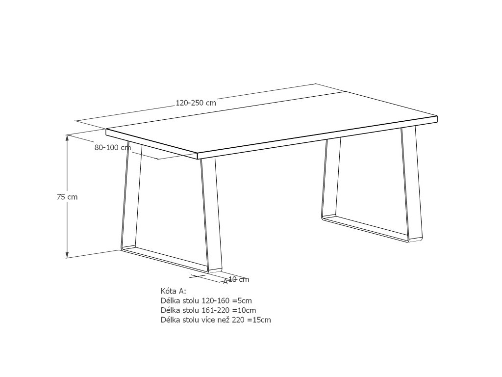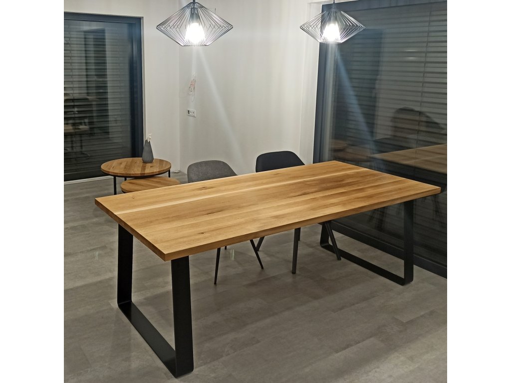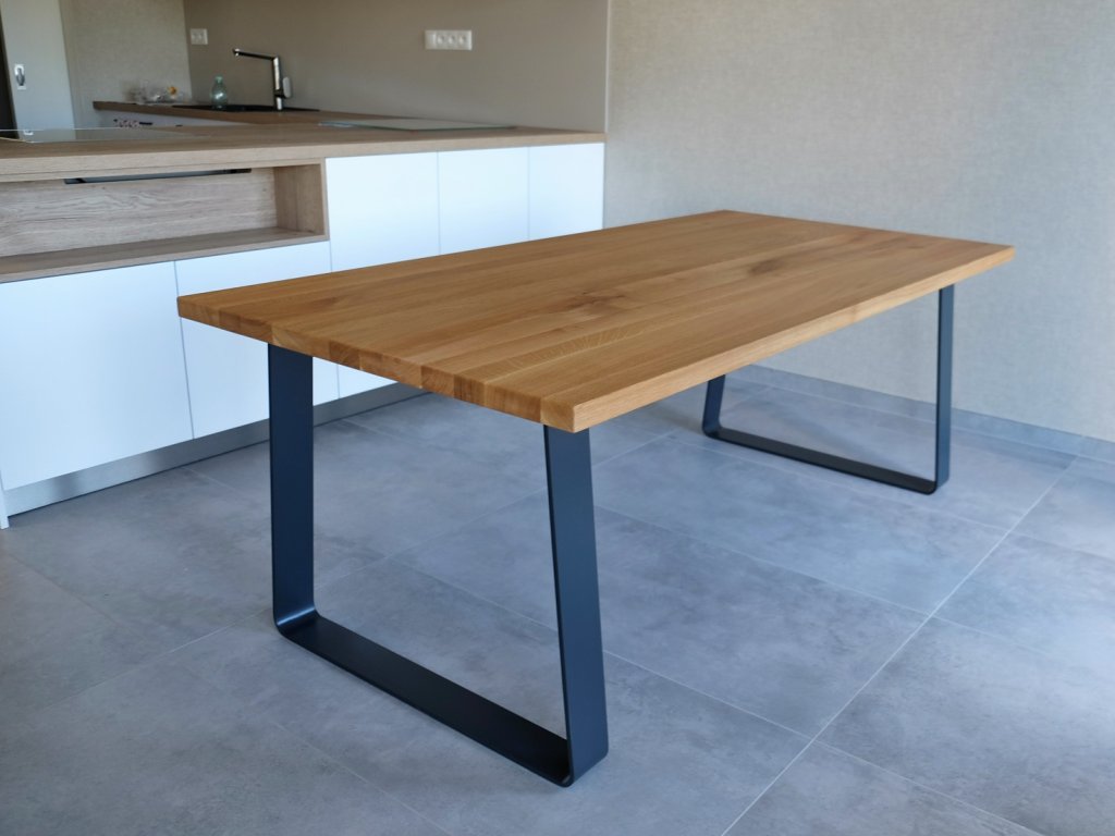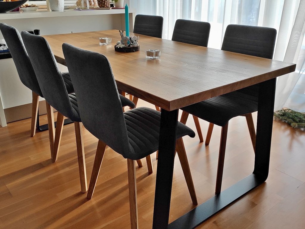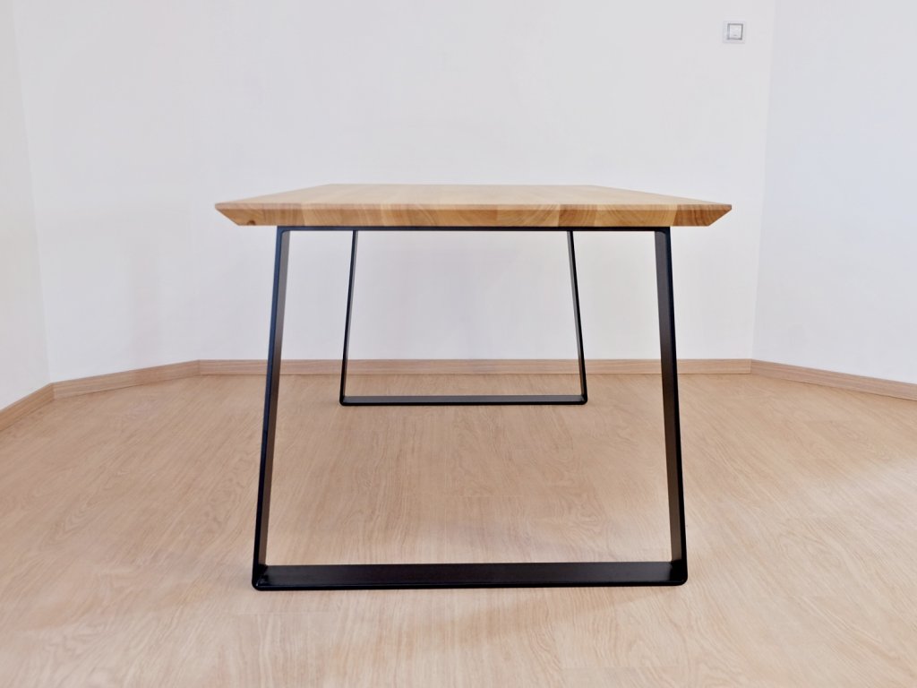 Kovová podnož je svařena z ohýbané ocelové pásoviny 100x10 mm. K dřevěné desce je podnož přišroubována pomocí závrtných matic, které v desce vytvoří pevný kovový závit. Tento spojovací prvek má proti vrutům obrovskou výhodu - stůl smontujete bez potřeby jakéhokoliv nářadí a vrtání do dřeva. Také se nemusíte bát poškození desky při několikanásobné demontáži nebo stěhování. Kovové nohy jsou lakovány práškovým lakem tzv. komaxitovou úpravou v průmyslové lakovně.