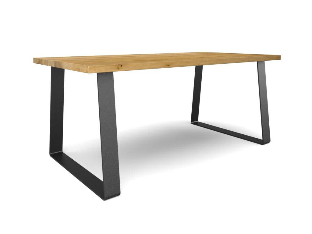 Industriální jídelní stůl z masivu a širokých ocelových pásů. Rozšiřující se podnož vytváří efektní tenké linie při pohledu z čela a výrazný profil z boku.