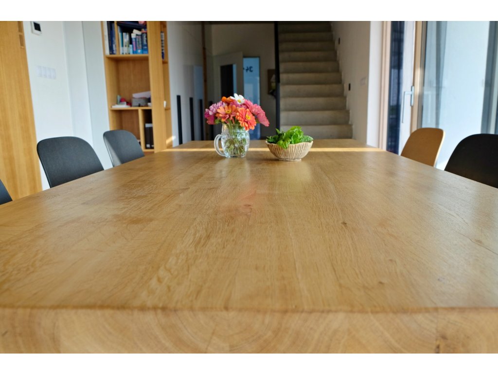 Desku stolu vyrábíme ze 40 mm silného masivního dubového/jasanového dřeva. Dub i jasan jsou velmi odolné dřeviny s nenahraditelnou přirozenou strukturou a je tím nejlepším, co můžete doma mít. Při správném zacházení vám naše masivní deska vydrží celý život. Pro zvýraznění struktury dřeva doporučujeme zvolit kartáčovanou úpravu povrchu, která desce dodá na dotek velmi příjemný "plastický" povrch. Desky jsou natřeny dvěma vrstvami tvrdého voskového oleje OSMO, který dřevo výborně chrání proti běžnému poškození a nechává dřevo přirozeně dýchat.