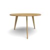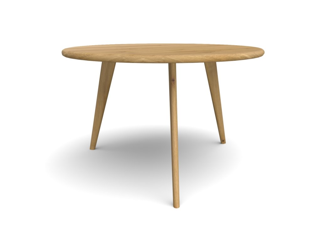 Celodřevěný kulatý Dlask ve skandinávském stylu zaujme detaily. Výrazné linie zužujících se nohou vyvažují všudypřítomné zaoblené hrany kulaté desky.
