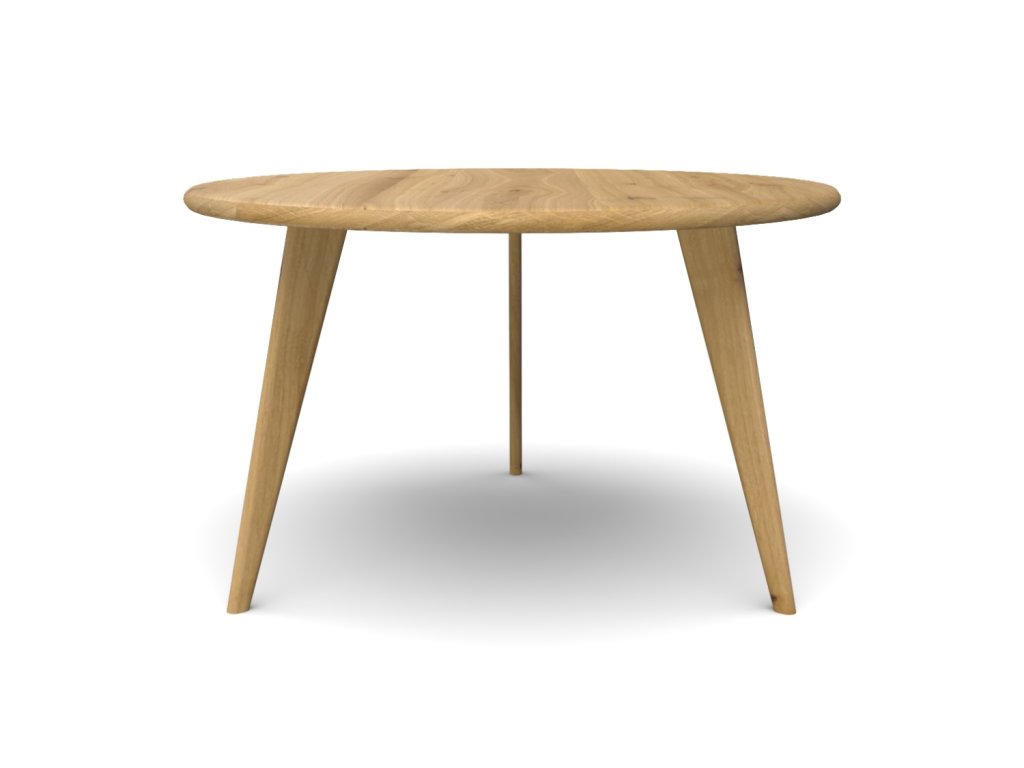 Celodřevěný kulatý Dlask ve skandinávském stylu zaujme detaily. Výrazné linie zužujících se nohou vyvažují všudypřítomné zaoblené hrany kulaté desky.
