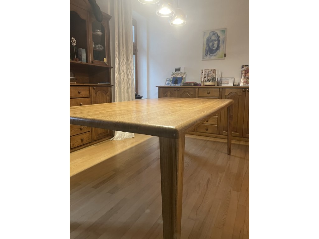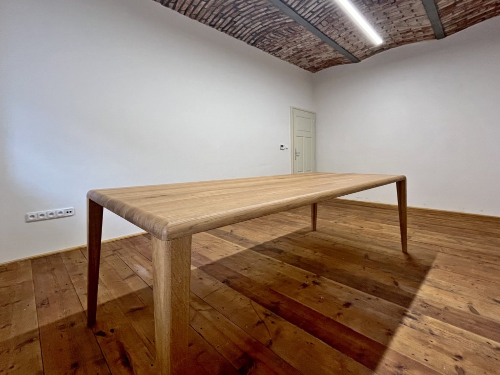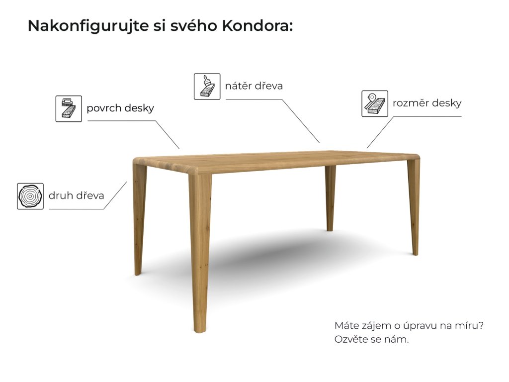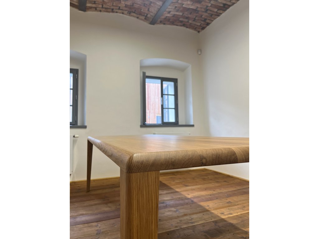 Celodřevěný stůl okouzlí souhrou křivek a oblých tvarů. Začíná už na desce, která kombinuje zakulacené rohy s hranami. Plynule přechází do nohou s vnitřním i vnějším obloukem. Díky tomu nohy vypadají pokaždé jinak – záleží na úhlu pohledu. Směrem dolů se elegantně zužují, až nakonec vytvářejí designový bod na podlaze.