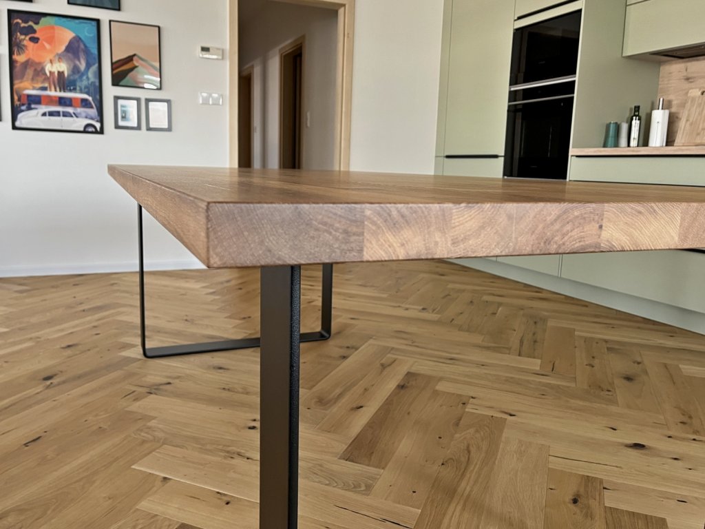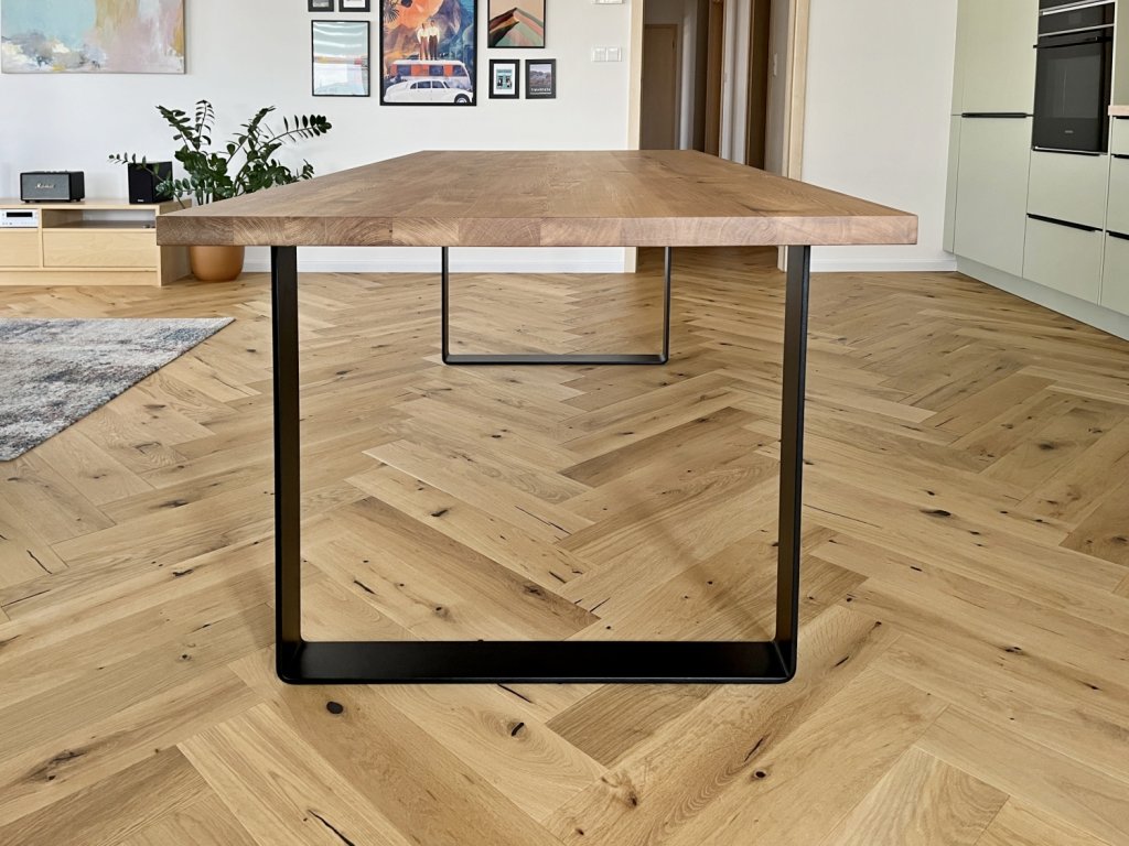 Ocelová pásovina unese nadstandardně velké a těžké dřevěné desky. Její tenký profil je praktický při sezení v čele stolu, kde nijak nepřekáží.
