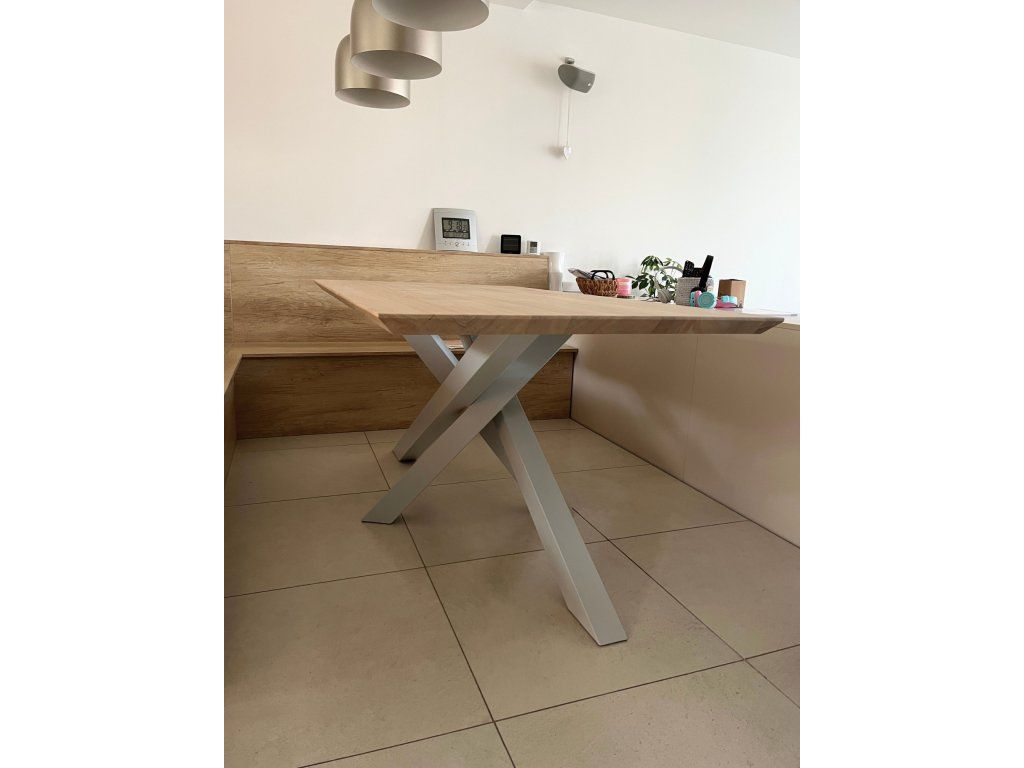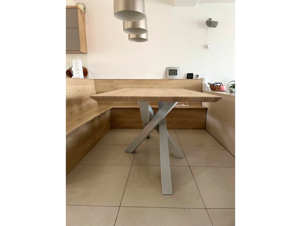 Kovová podnož je svařena z ocelových profilů 80x80 mm.K dřevěné desce je podnož přišroubována pomocí závrtných matic, které v desce vytvoří pevný kovový závit. Tento spojovací prvek má proti vrutům obrovskou výhodu - stůl smontujete bez potřeby jakéhokoliv nářadí a vrtání do dřeva. Také se nemusíte bát poškození desky při několikanásobné demontáži nebo stěhování. Kovové nohy jsou lakovány práškovým lakem tzv. komaxitovou úpravou v průmyslové lakovně.