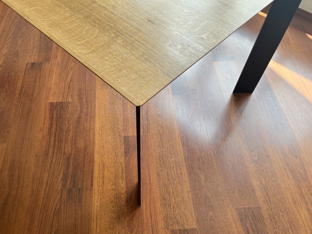 Symetrie linií a působivé prolnutí materiálů v jednom do detailu zpracovaném stolu. Dřevěná deska se zkosenou hranou plynule přechází do nohou z ocelové pásoviny, směřujících do středu stolu.