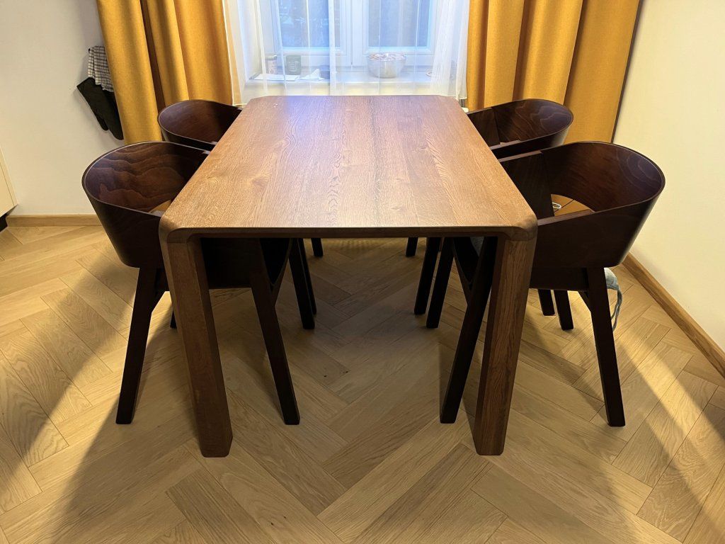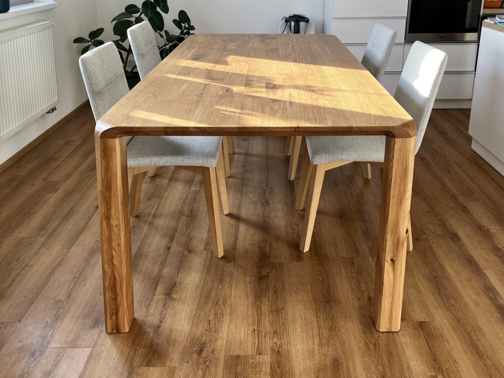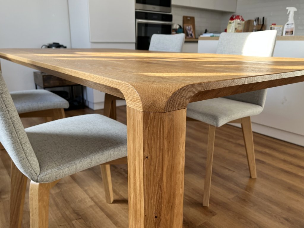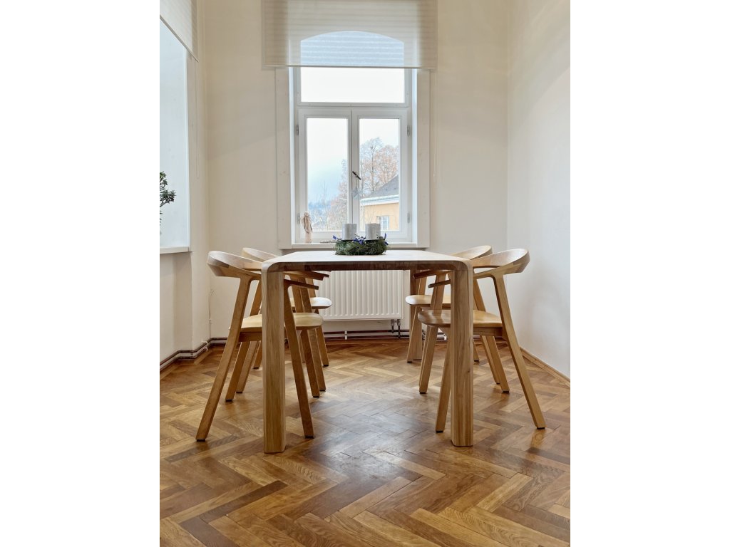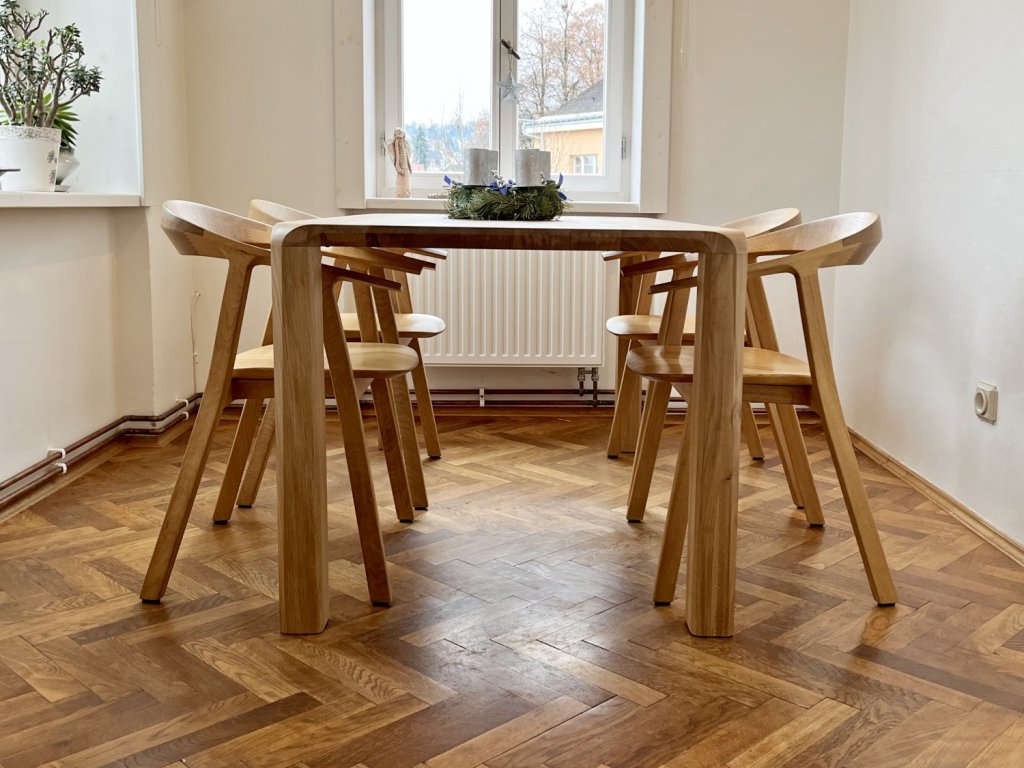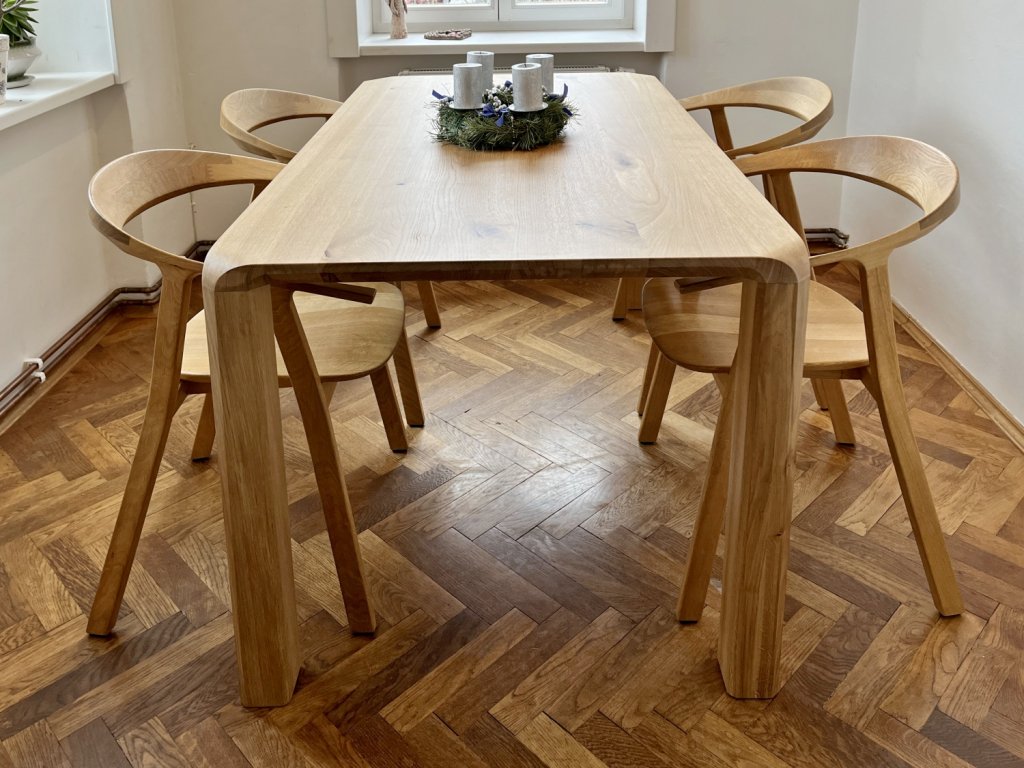 Jako když stéká voda po kameni. Takové jsou rohy celodřevěného stolu, který působí jako jeden kus. Detaily jsme vyladili do posledního milimetru, aby vynikly minimalistické linie v nadčasovém organickém tvaru.