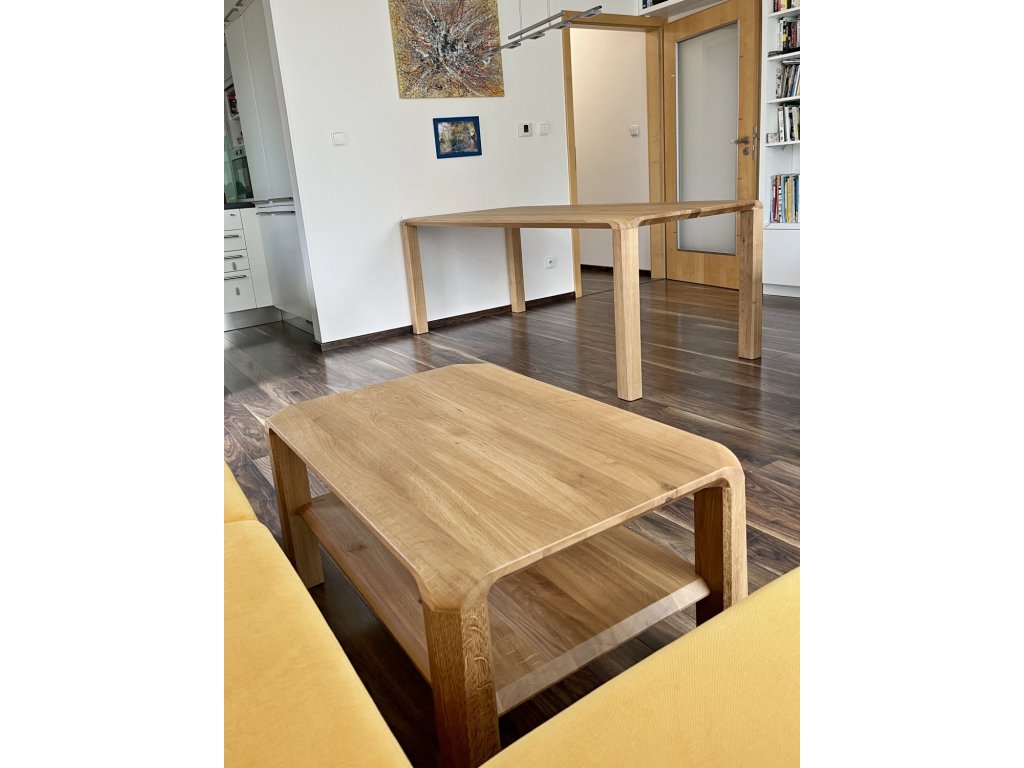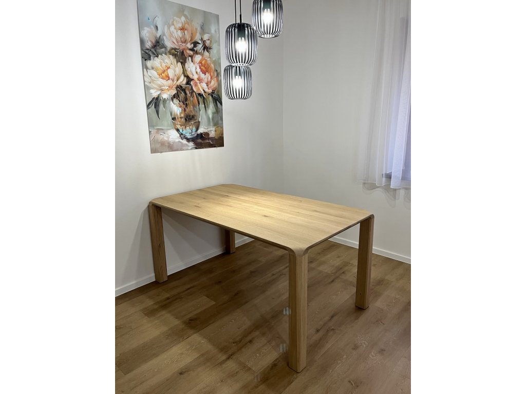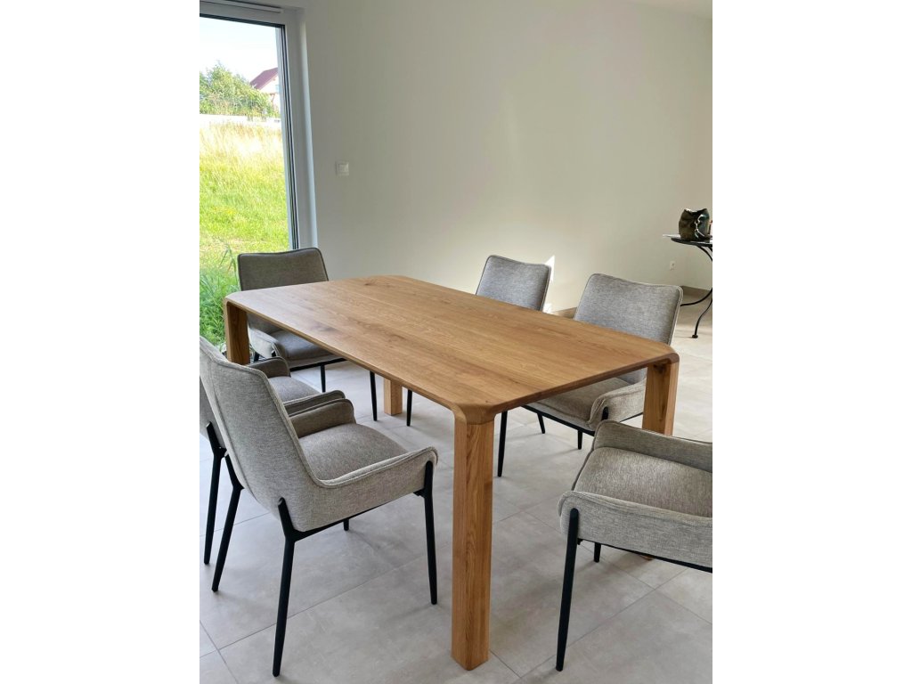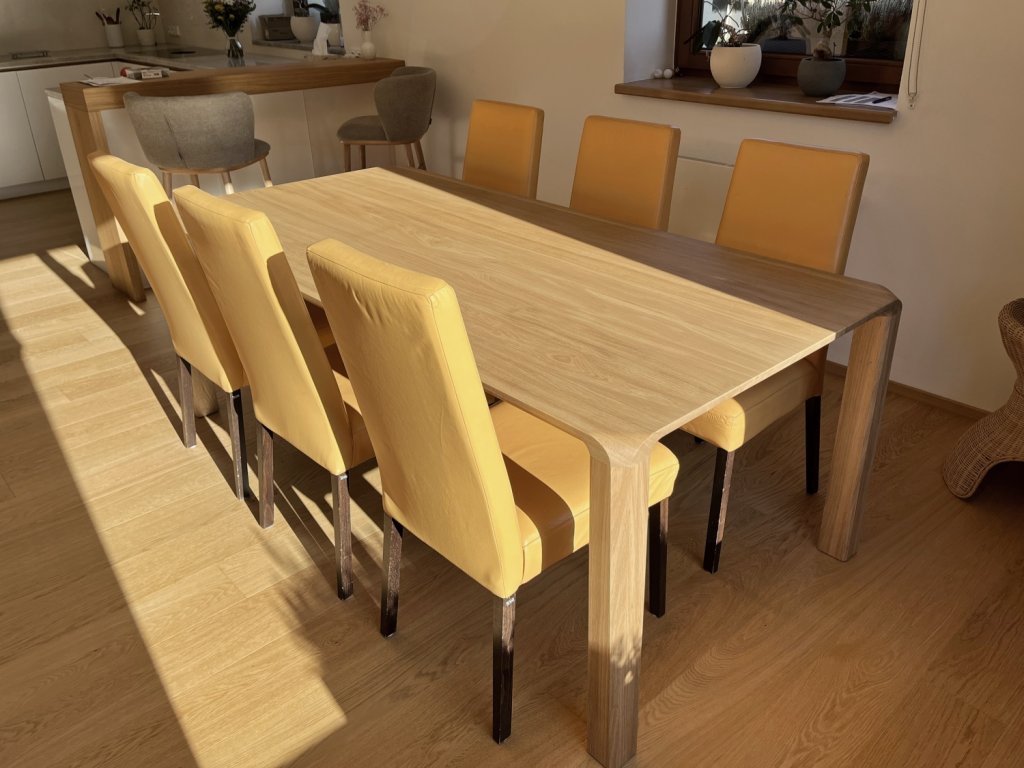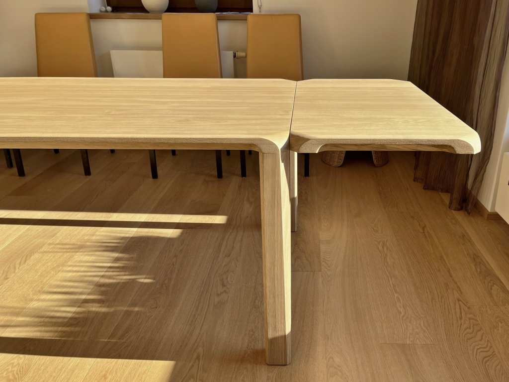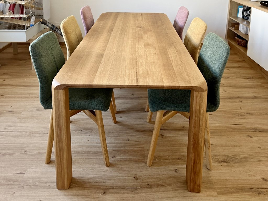 Jako když stéká voda po kameni. Takové jsou rohy celodřevěného stolu, který působí jako jeden kus. Detaily jsme vyladili do posledního milimetru, aby vynikly minimalistické linie v nadčasovém organickém tvaru.
