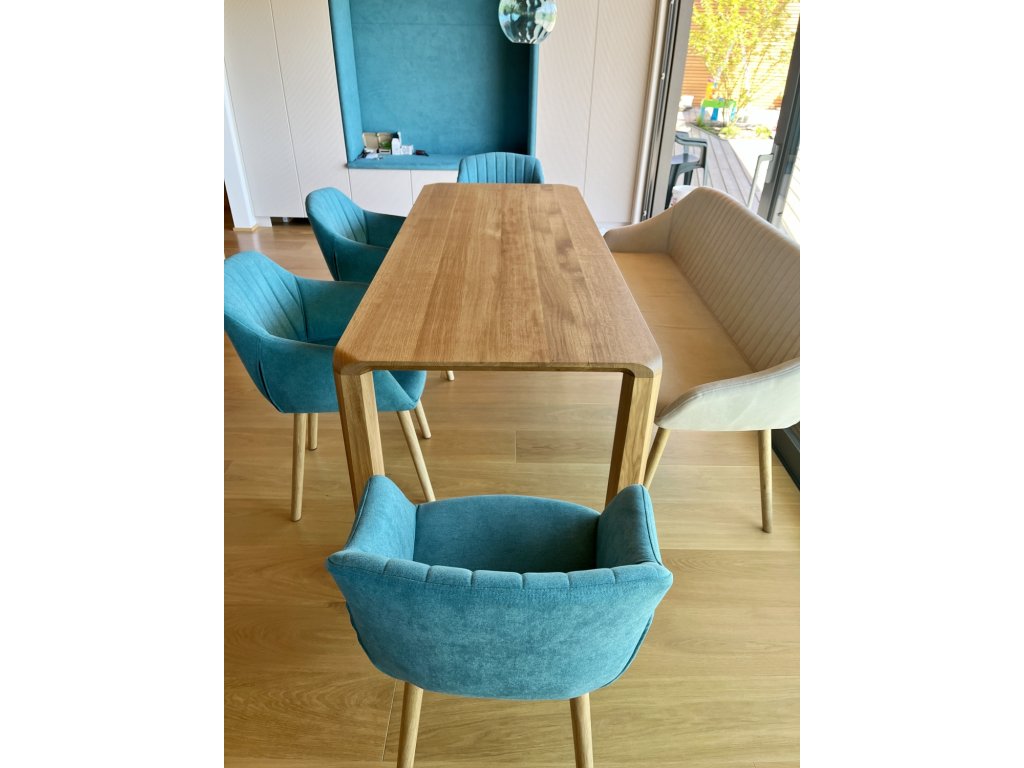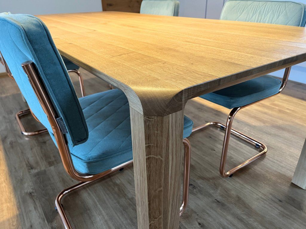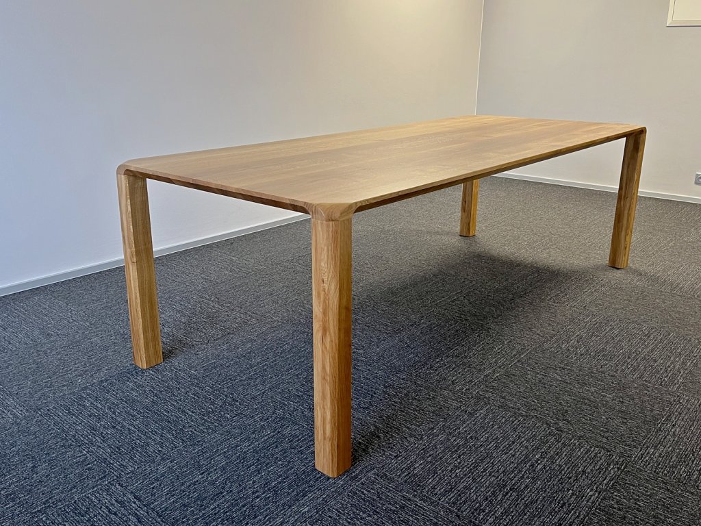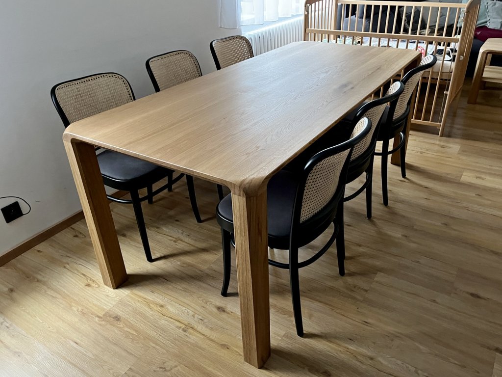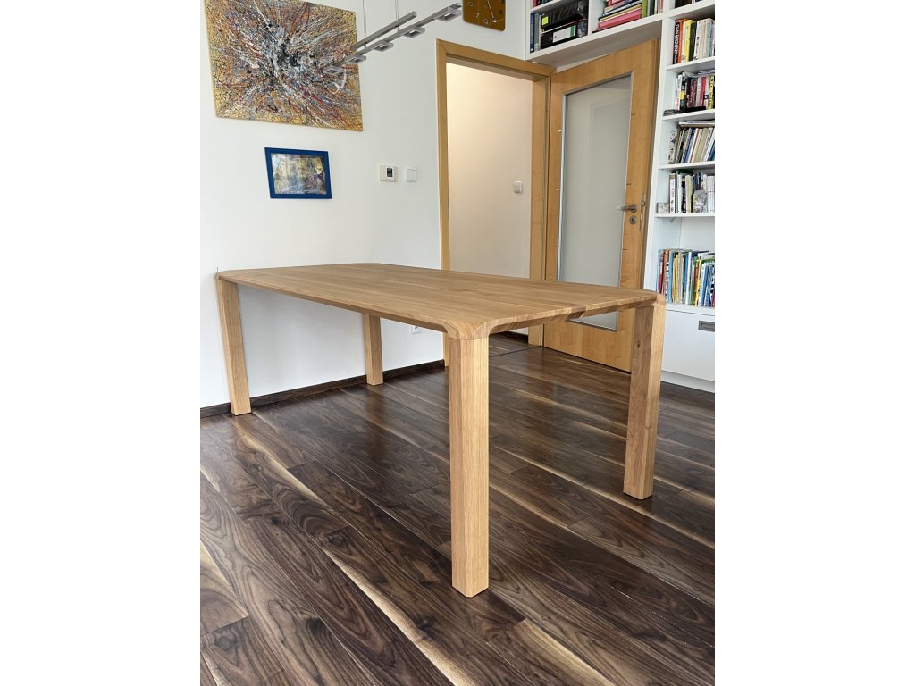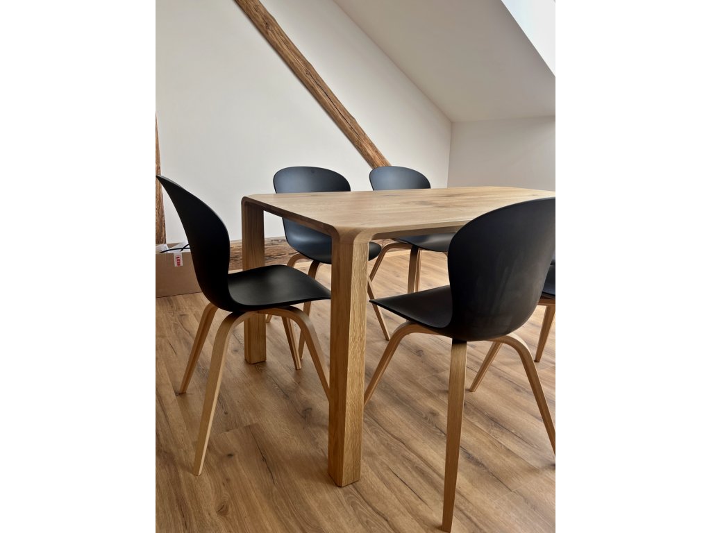 Jako když stéká voda po kameni. Takové jsou rohy celodřevěného stolu, který působí jako jeden kus. Detaily jsme vyladili do posledního milimetru, aby vynikly minimalistické linie v nadčasovém organickém tvaru.