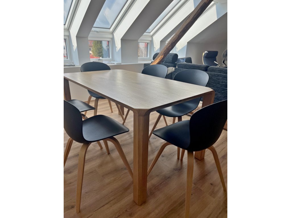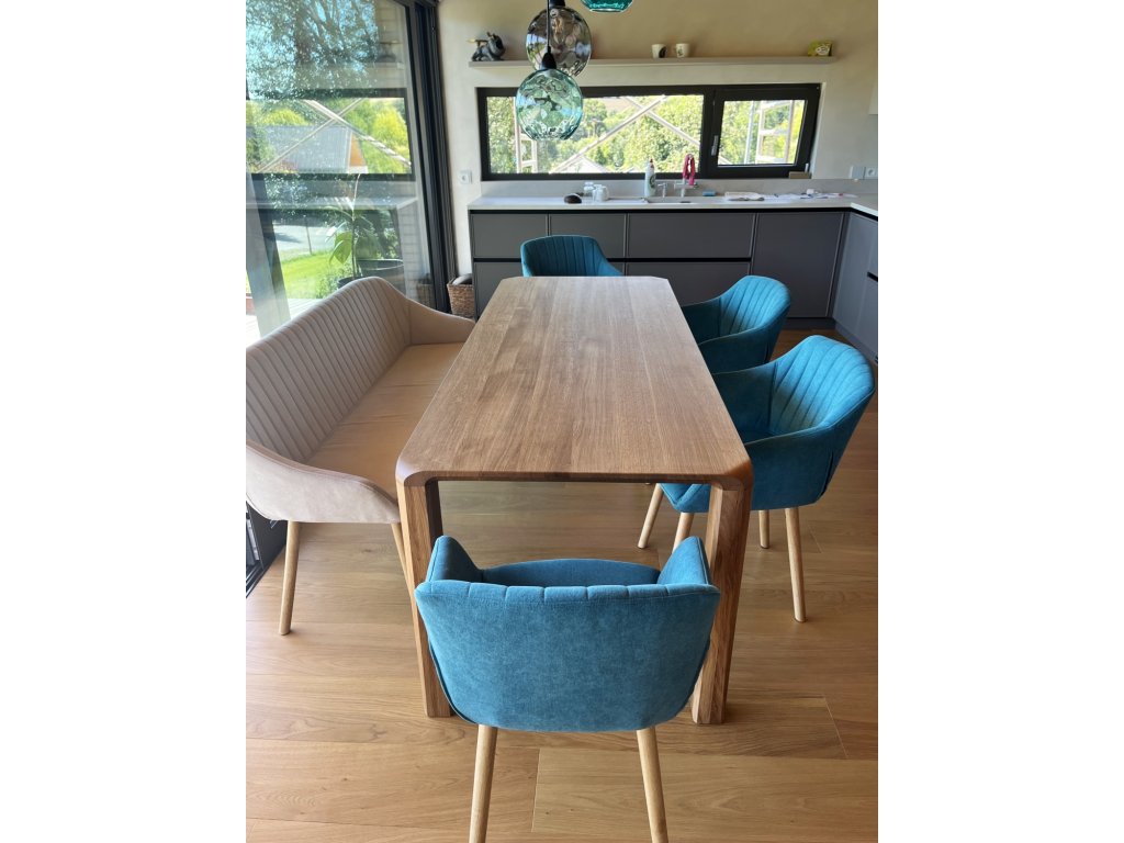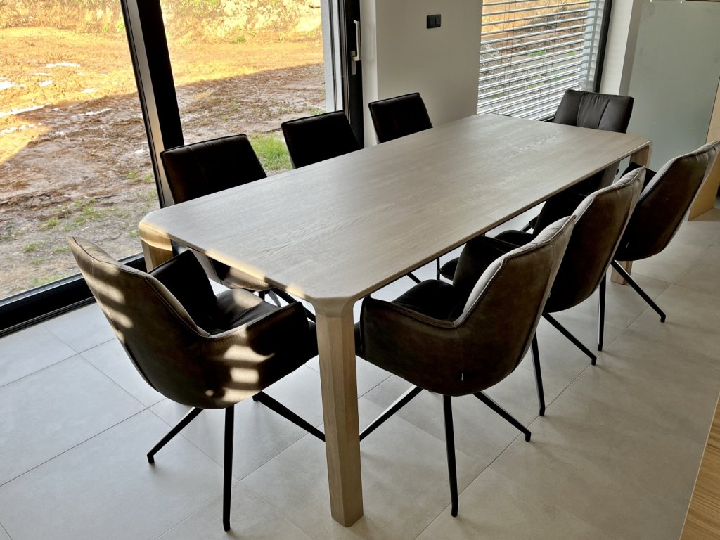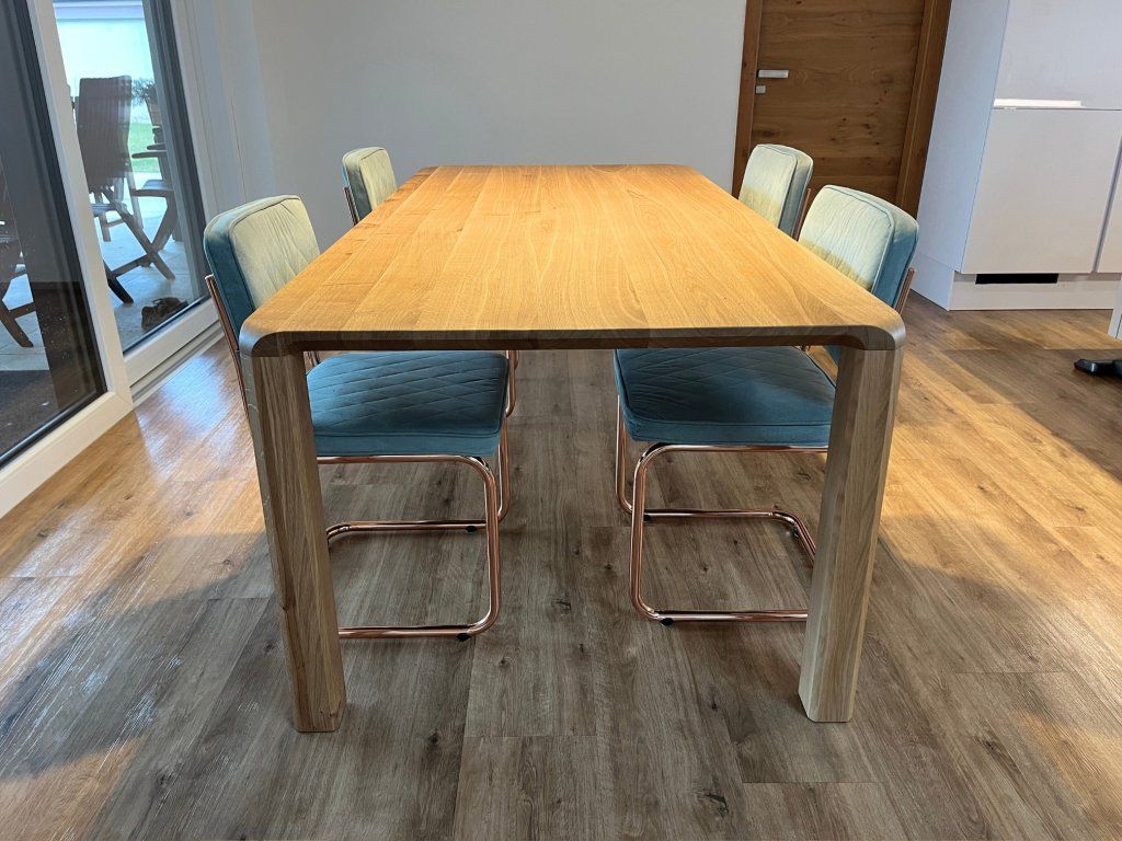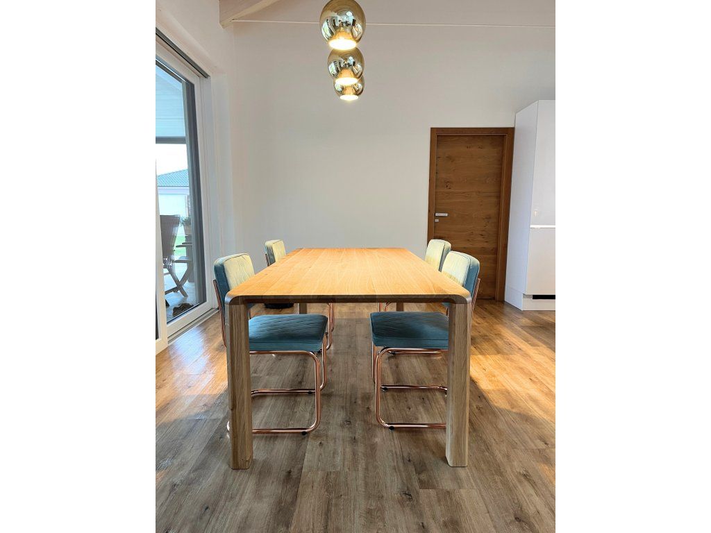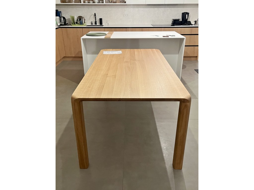 Jako když stéká voda po kameni. Takové jsou rohy celodřevěného stolu, který působí jako jeden kus. Detaily jsme vyladili do posledního milimetru, aby vynikly minimalistické linie v nadčasovém organickém tvaru.