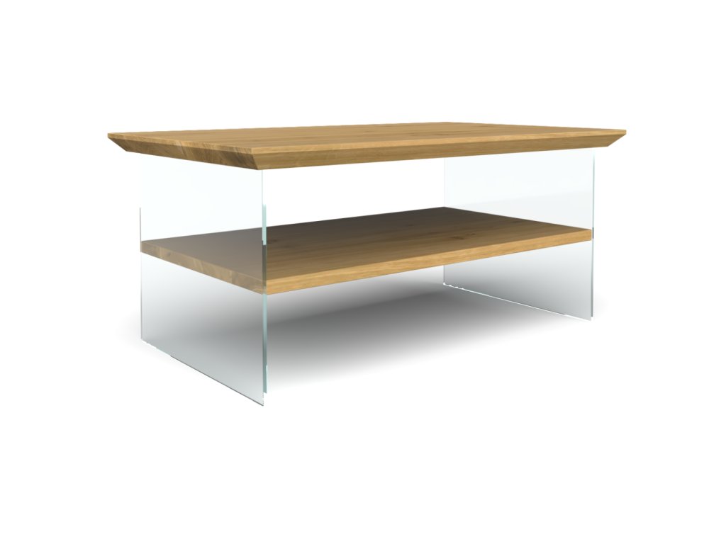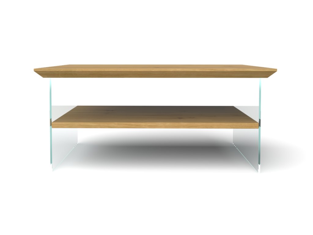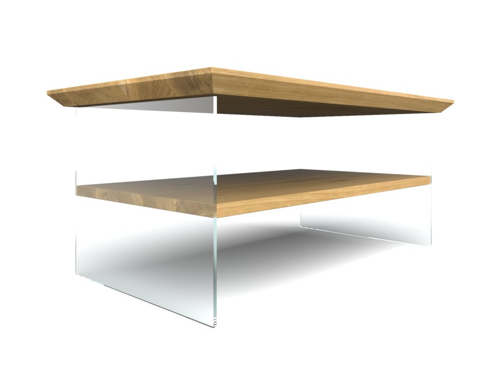 Horní deska zaručuje pevnost, zatímco tenčí spodní polička dodává stolku jemnost a harmonii. Spojení skla a odkládací desky zajišťuje neviditelný spoj pomocí ultra pevné čiré VHB pásky.