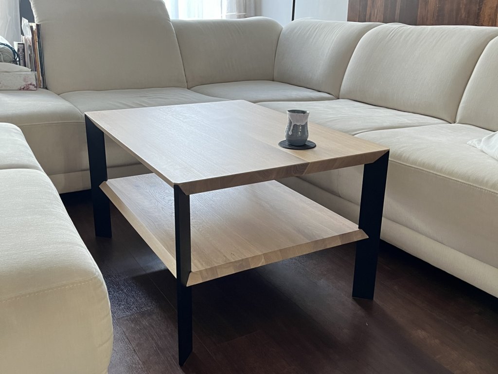 Kovová konstrukce je vyrobena z laserm vypálného a svařeného profilu. K dřevěné desce jsou nohy přišroubovány pomocí závrtných matic, které v desce vytvoří pevný kovový závit. Stolek je dodáván složený. Kovové nohy jsou lakovány práškovým lakem tzv. komaxitovou úpravou v průmyslové lakovně.