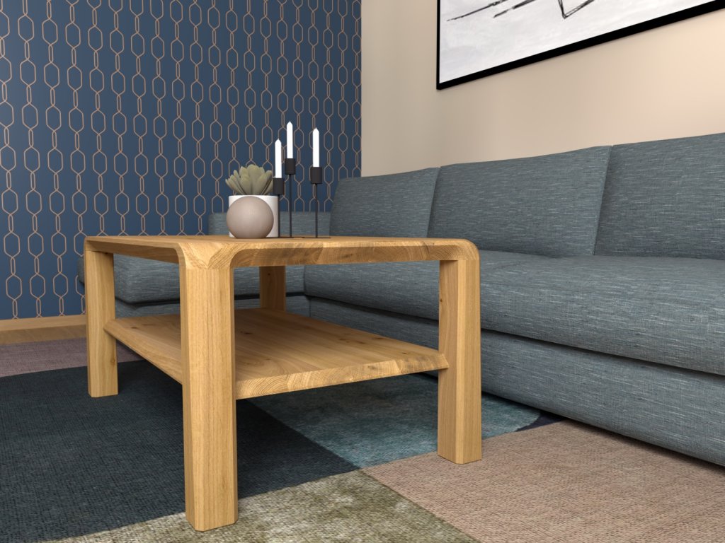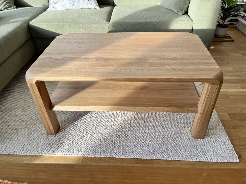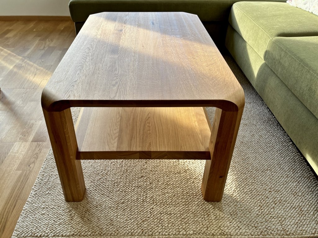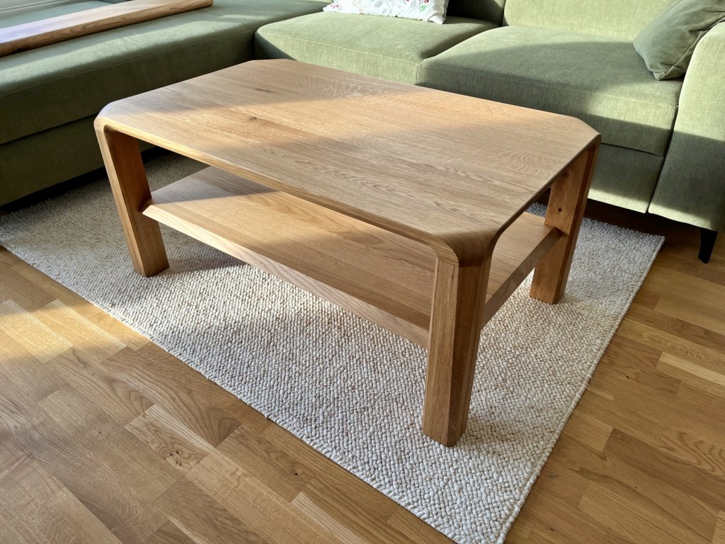 Jako když stéká voda po kameni. Takové jsou rohy celodřevěného stolku, který působí jako jeden kus. Detaily jsme vyladili do posledního milimetru, aby vynikly minimalistické linie v nadčasovém organickém tvaru.