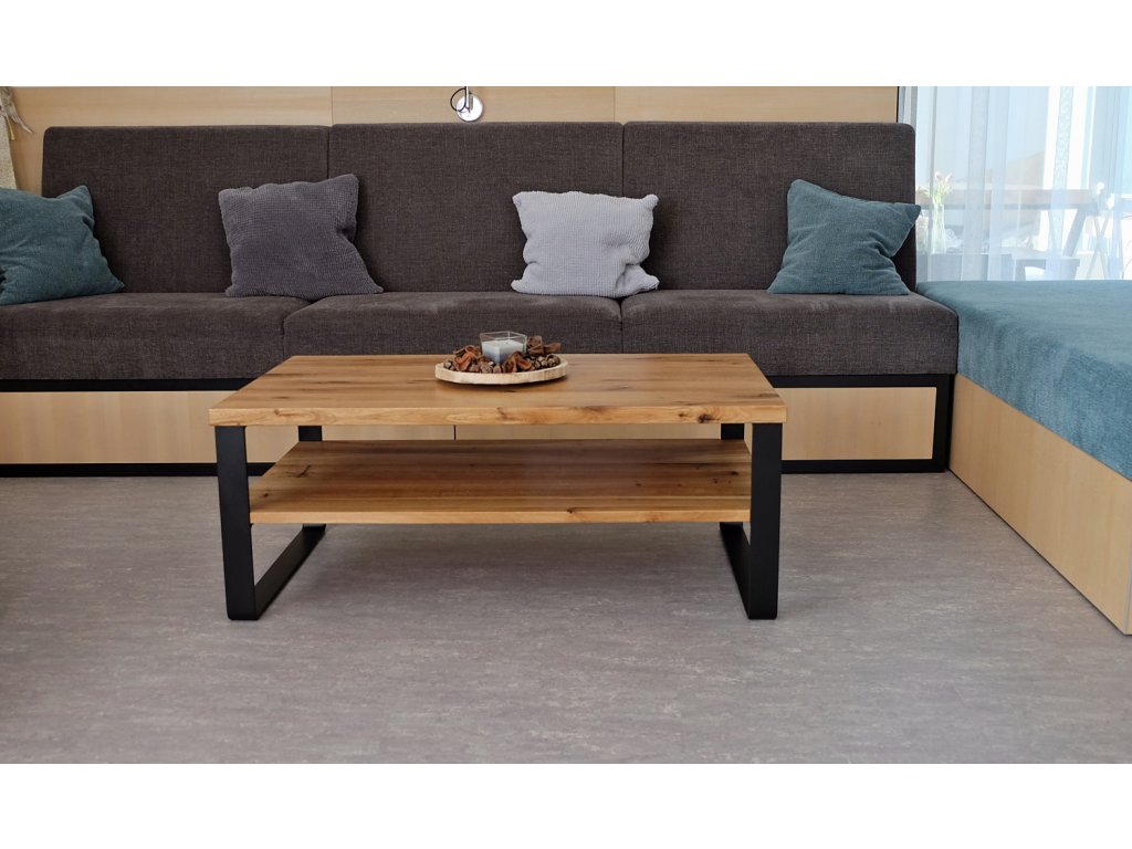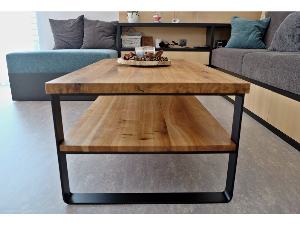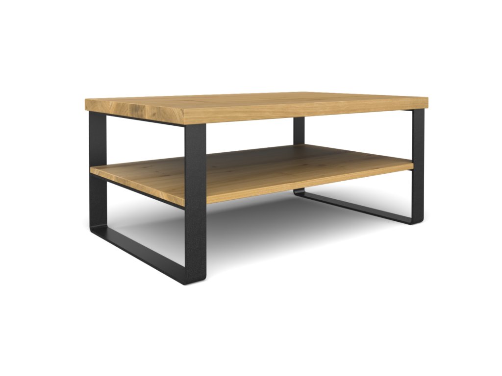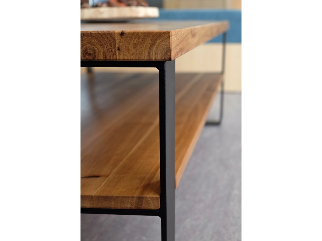 Industriální konferenční stolek z masivu a ohýbaných ocelových pásů. Jednoduché pravoúhlé linie potěší milovníky minimalismu.