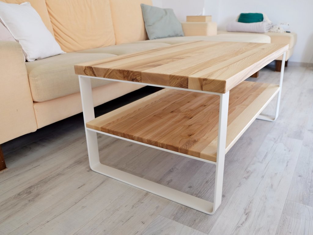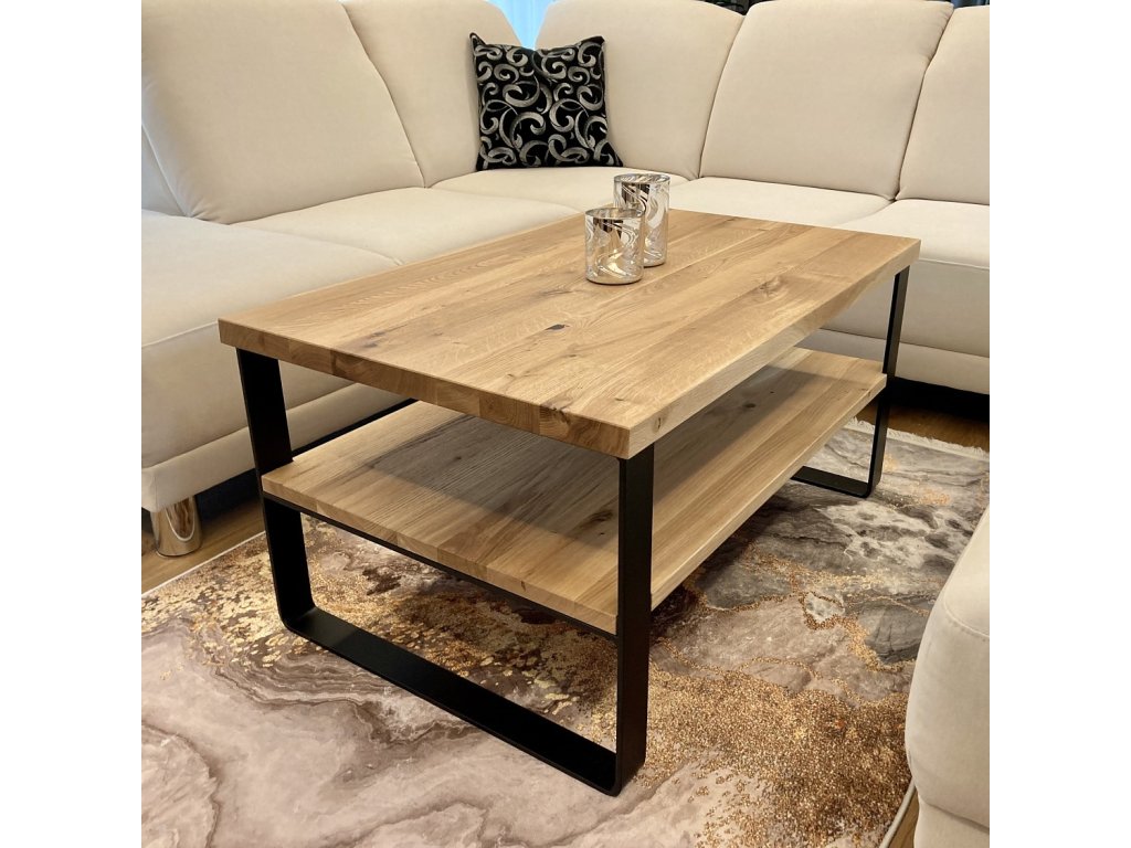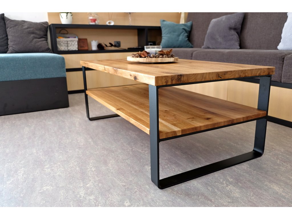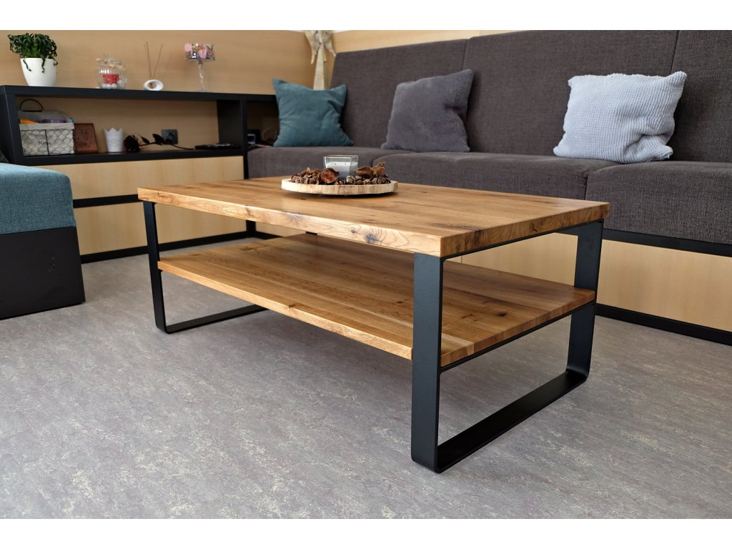 Industriální konferenční stolek z masivu a ohýbaných ocelových pásů. Jednoduché pravoúhlé linie potěší milovníky minimalismu.