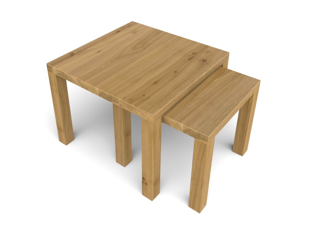 Dva stolky, nespočet využití. Můžete je postavit samostatně, vedle sebe nebo je zasunout jeden do druhého. Celodřevěné stolky Drozdík charakterizují minimalistické linie a kolmé nohy v rozích.