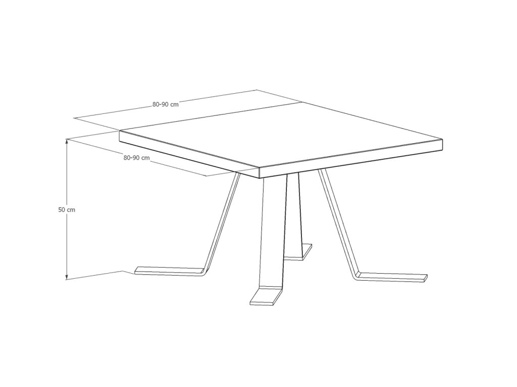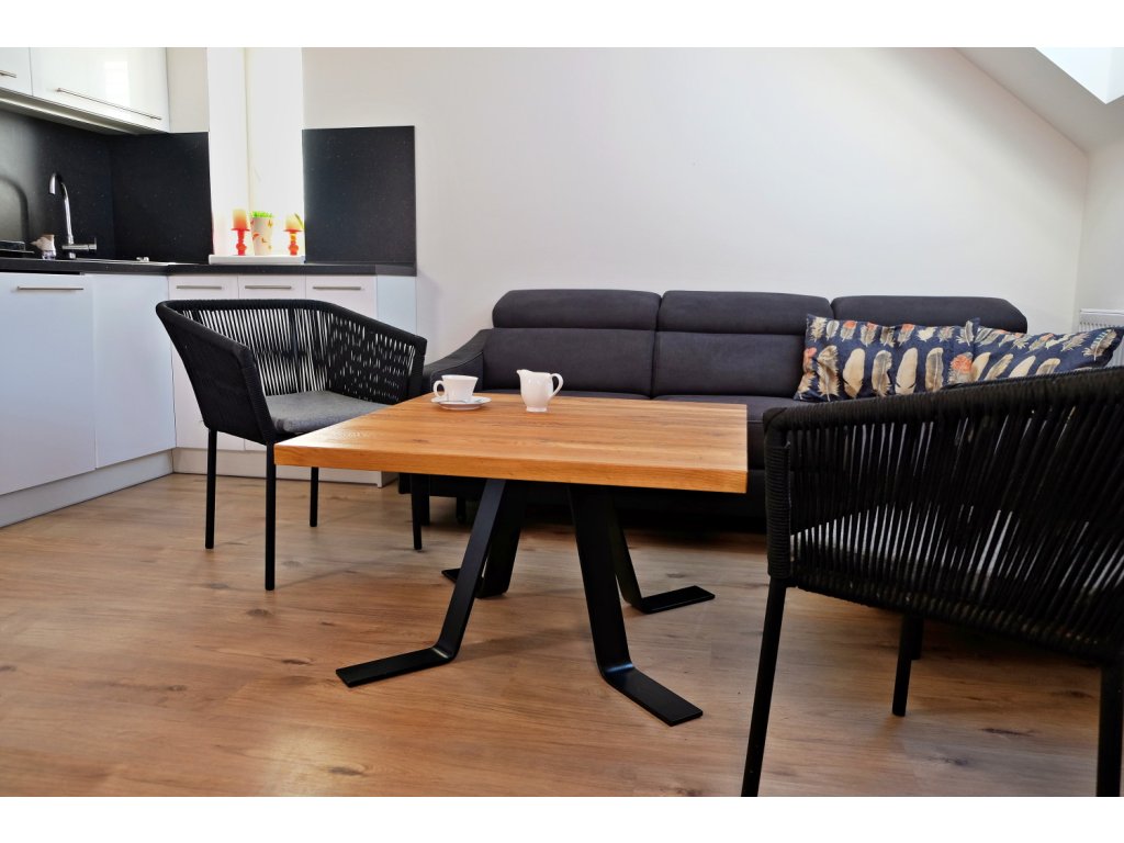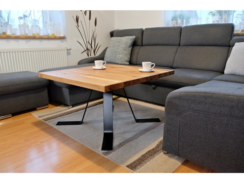 Kovová podnož je tvořena čtyřma nohama z ohýbané ocelové pásoviny 80x10 cm. K dřevěné desce jsou nohy přišroubovány pomocí vrutů, a stolek je dodáván zkompletovaný. Kovové nohy jsou lakovány práškovým lakem tzv. komaxitovou úpravou v průmyslové lakovně.