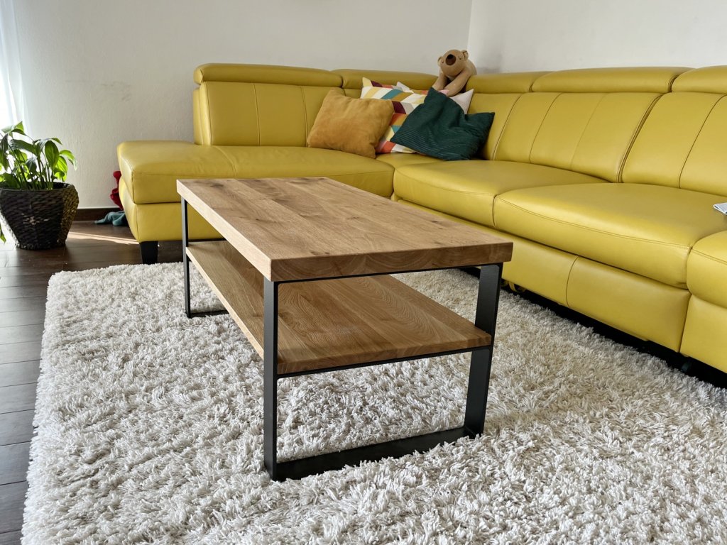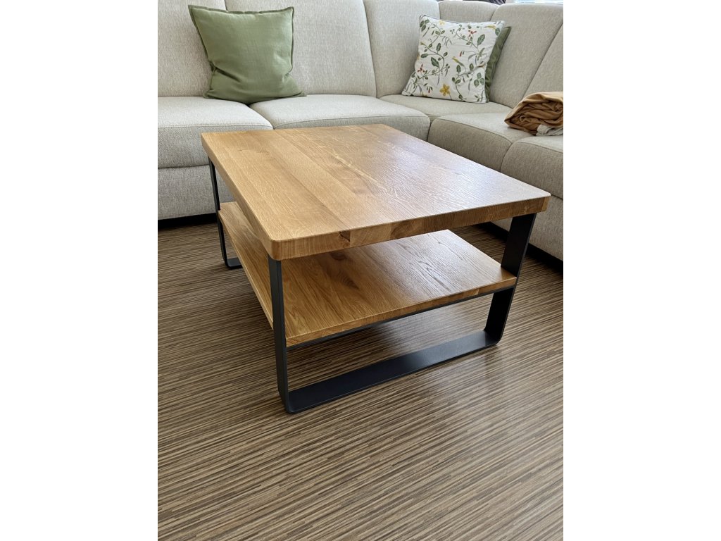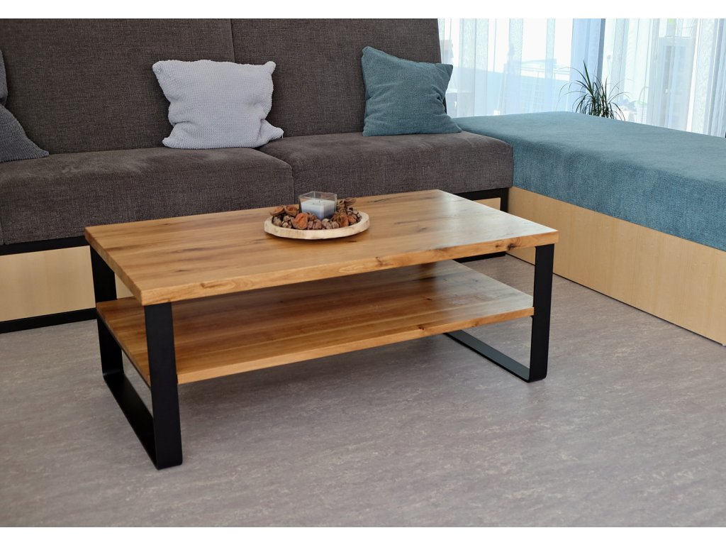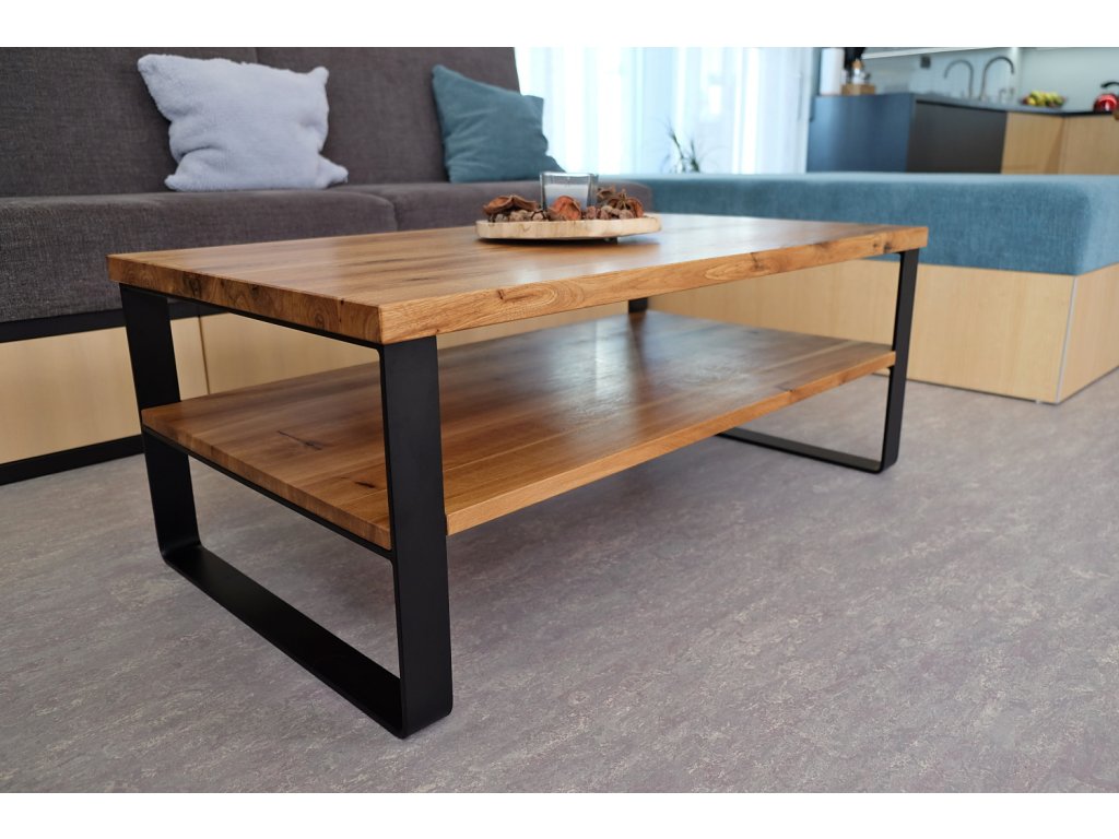 Industriální konferenční stolek z masivu a ohýbaných ocelových pásů. Jednoduché pravoúhlé linie potěší milovníky minimalismu.