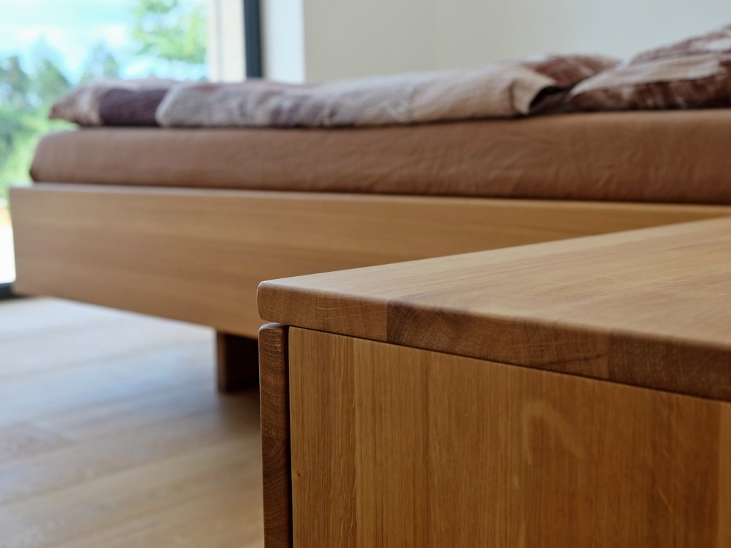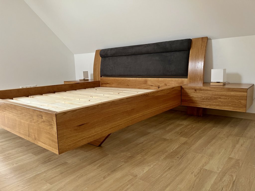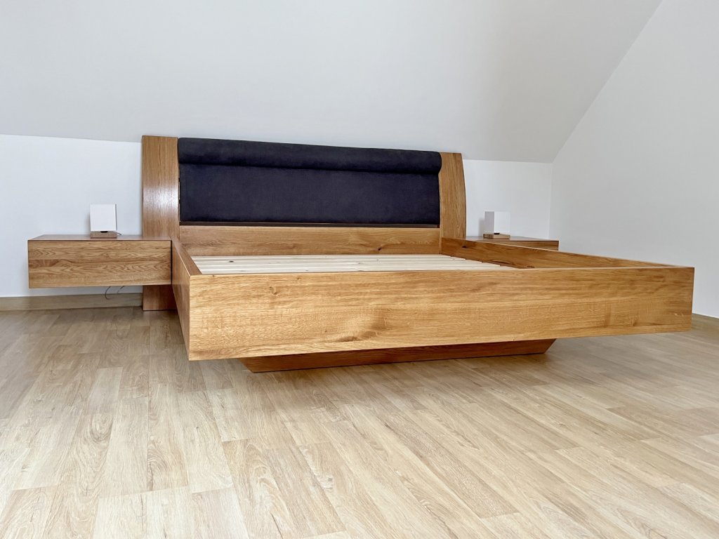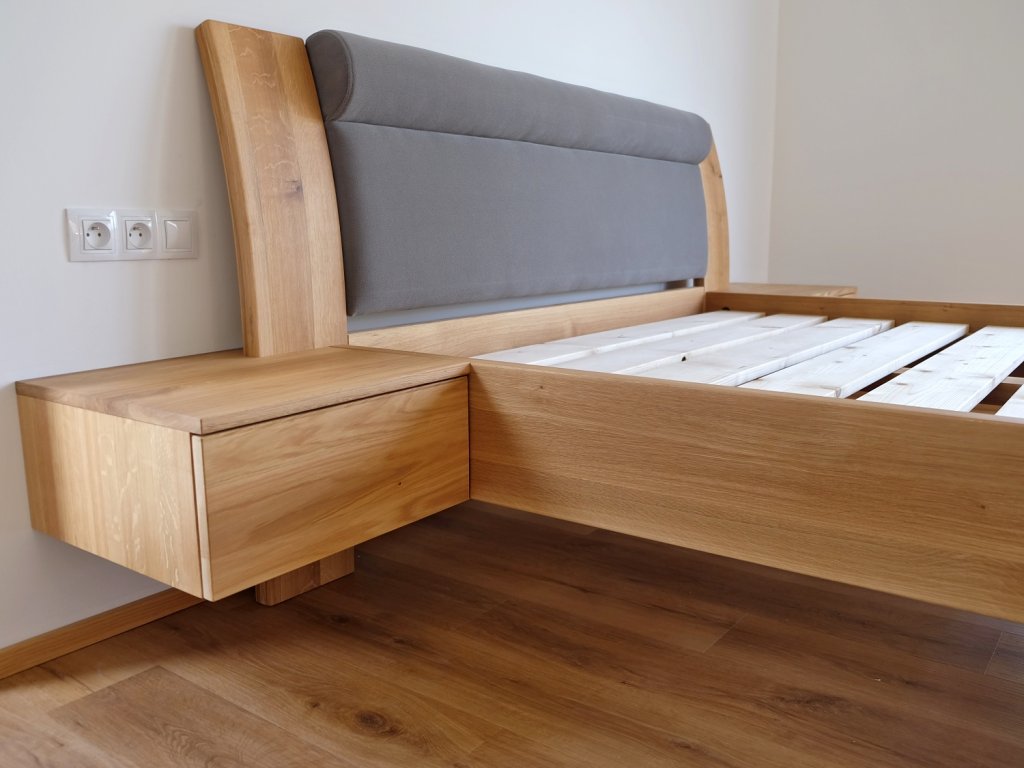 Celá konstrukce postele je vyrobena ze 40 mm silného masivního dubového dřeva. Dub je velmi odolná dřevina s nenahraditelnou přirozenou strukturou a je tím nejlepším, co můžete doma mít. Při správném zacházení vám dubová postel vydrží celý život. Dřevo je natřené dvěma vrstvami tvrdého voskového oleje OSMO, který dřevo výborně chrání proti běžnému poškození a nechává dřevo přirozeně dýchat. Můžete si zvolit odstín povrchové úpravy masivní desky.