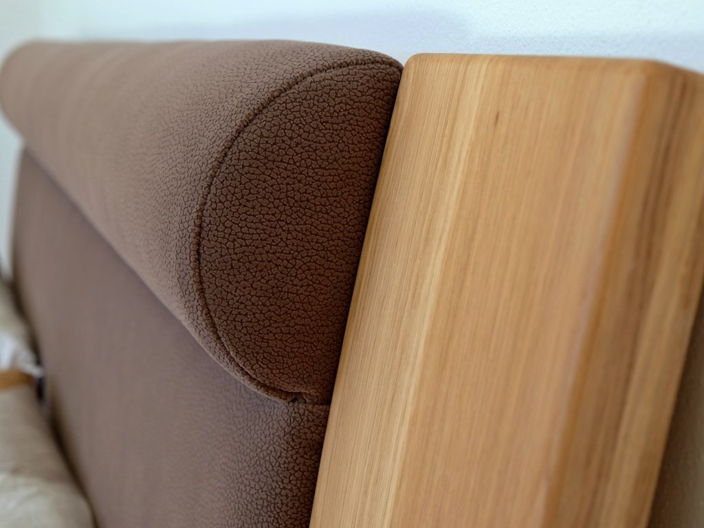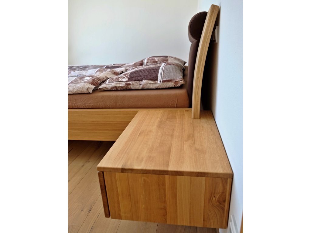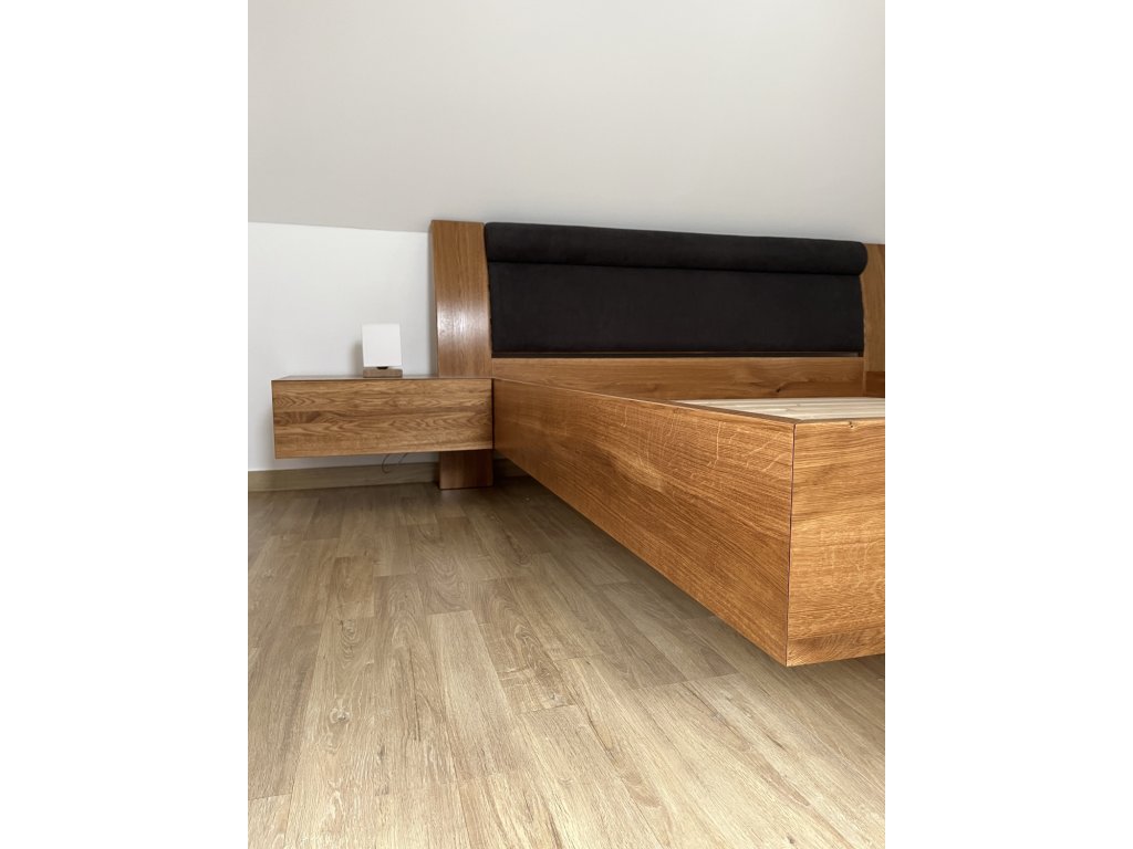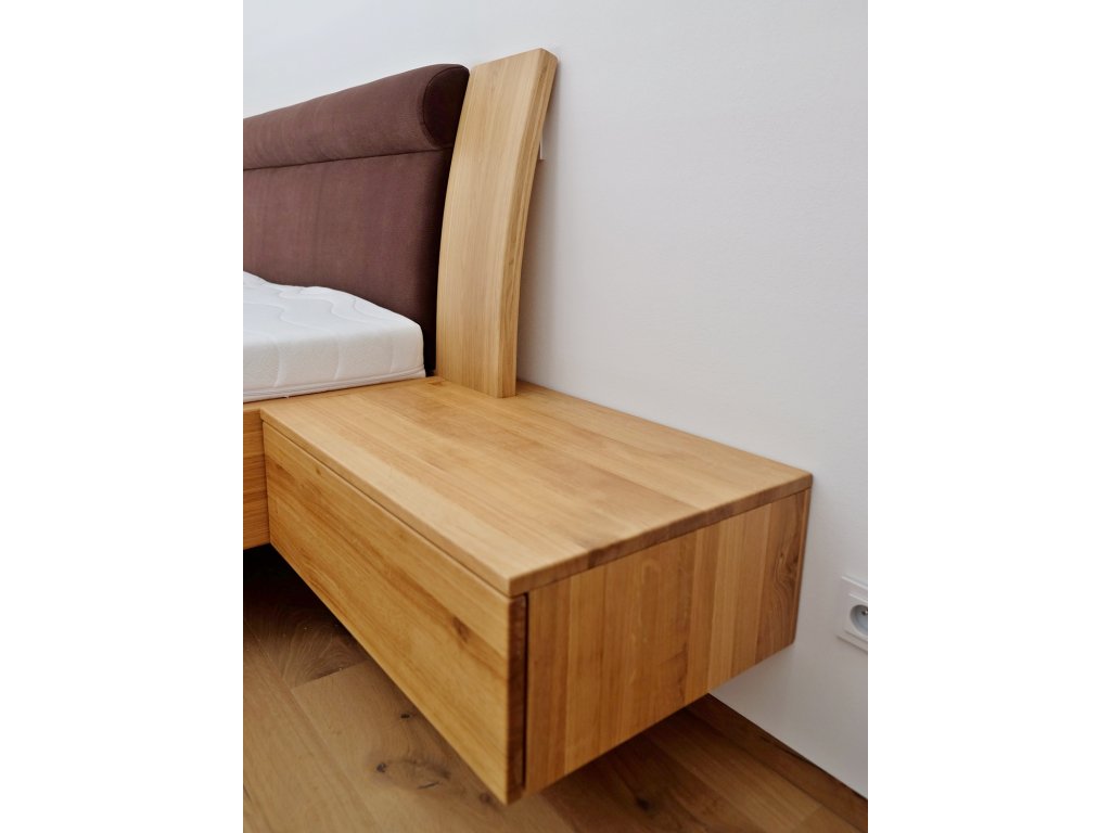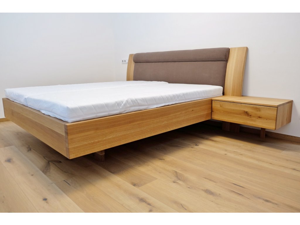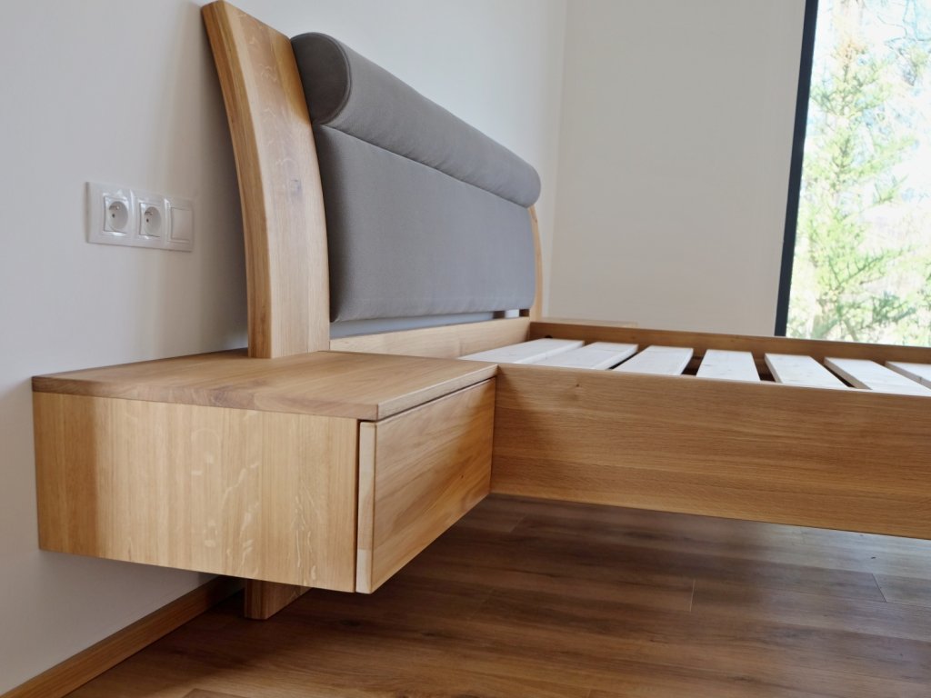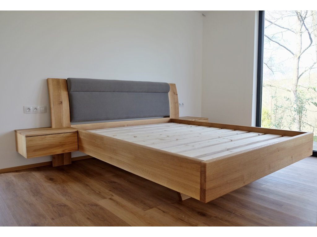 Masivní dubová postel Pisila na první pohled levituje v prostoru, přesto je svou konstrukcí stabilní a pevná. Dynamické zakřivení čalouněného čela a zapuštěné noční stolky posouvají design postele o několik úrovní výše.