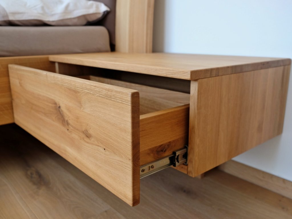 Rozměry nočních stolků: 70 x 47 x 25 cm (šířka x hloubka x výška). Na přání je možná úprava. Hrany zásuvek od 1.10.2025 vyrábíme na pokos.