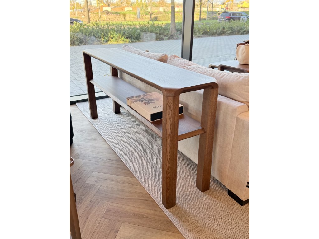 Minimalistickému stolku vévodí čtvercové nohy v rozích. S deskou se spojují tak precizně, že stůl působí jako jeden kus dřeva.