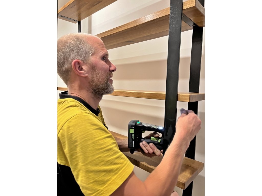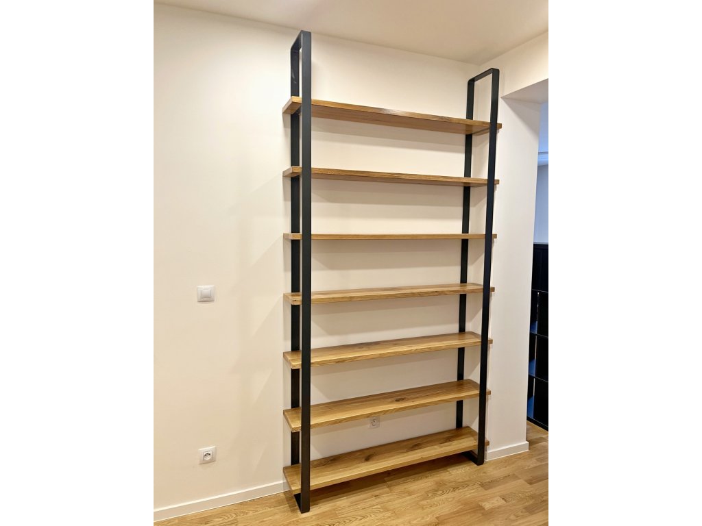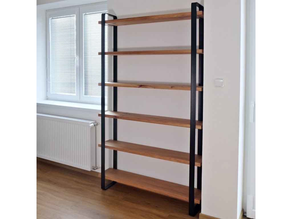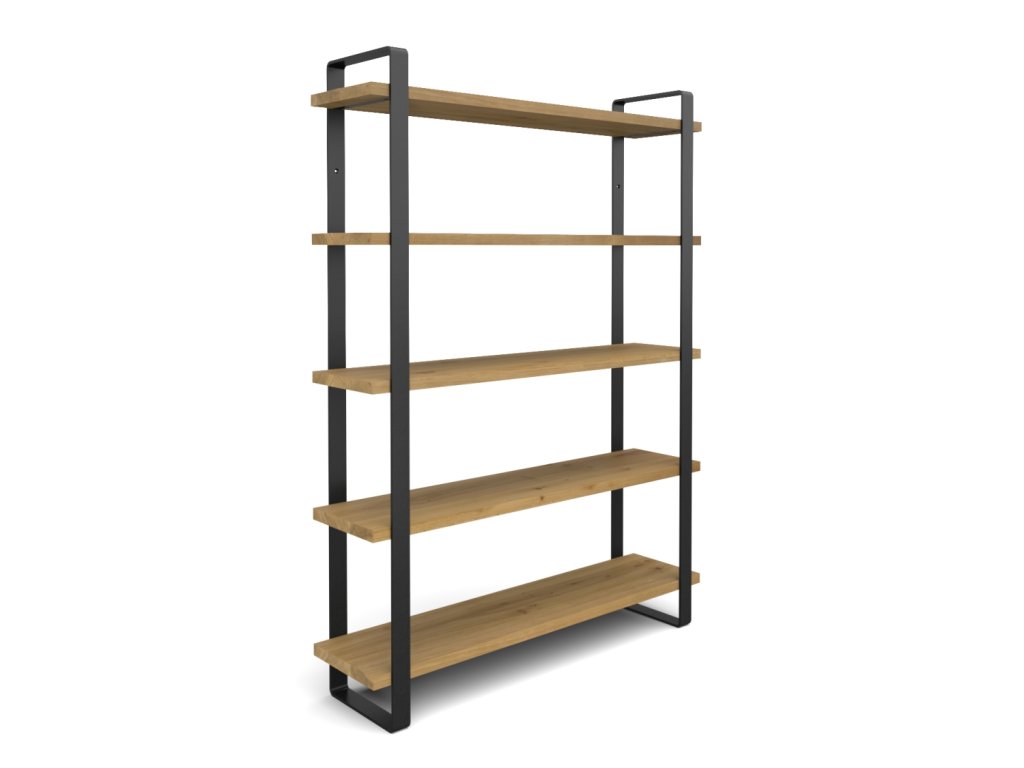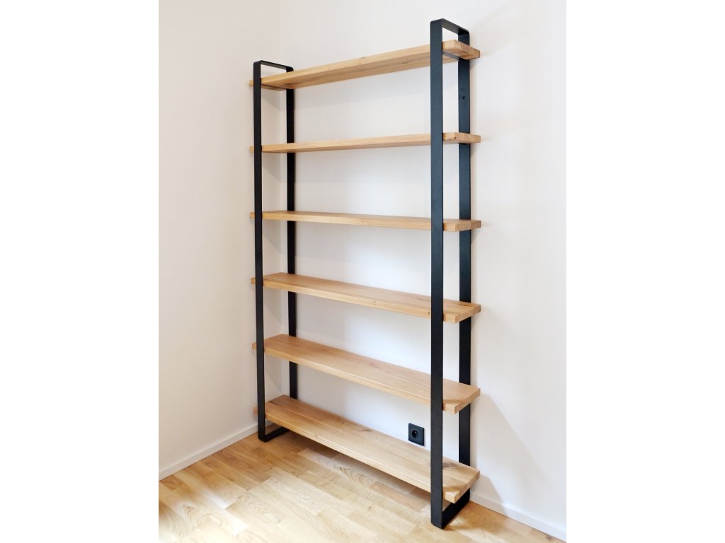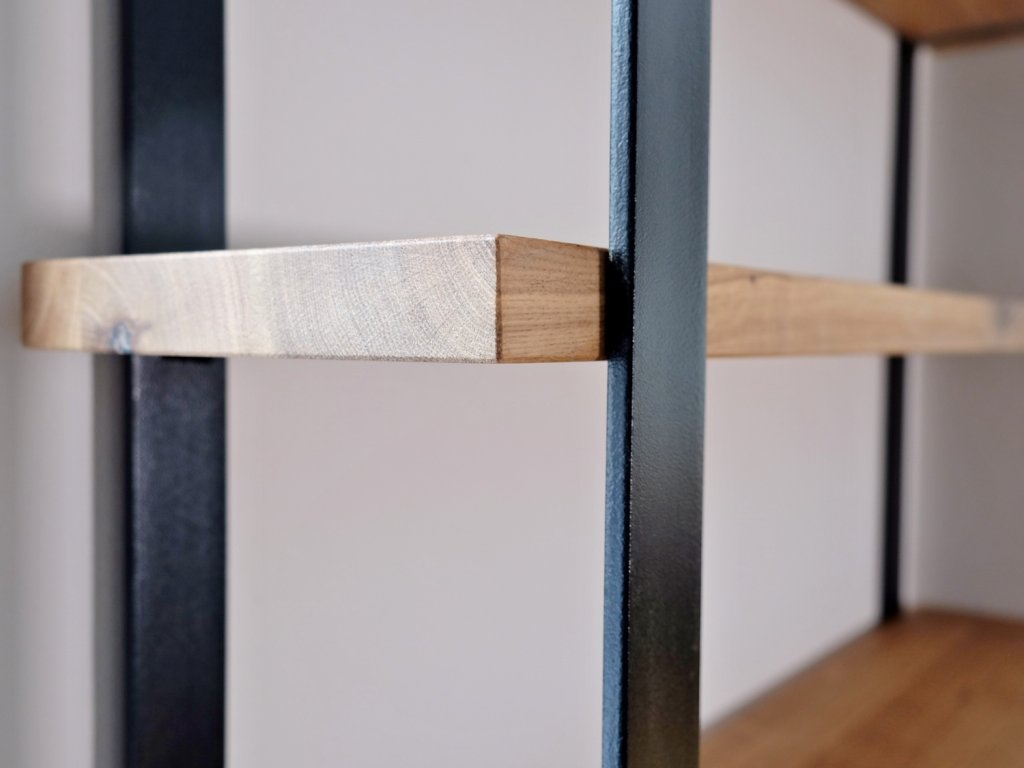 Dřevěné police jsou zafrézované do kovových nosníků, což celému regálu dodává vzdušnost při zachování velké nosnosti.