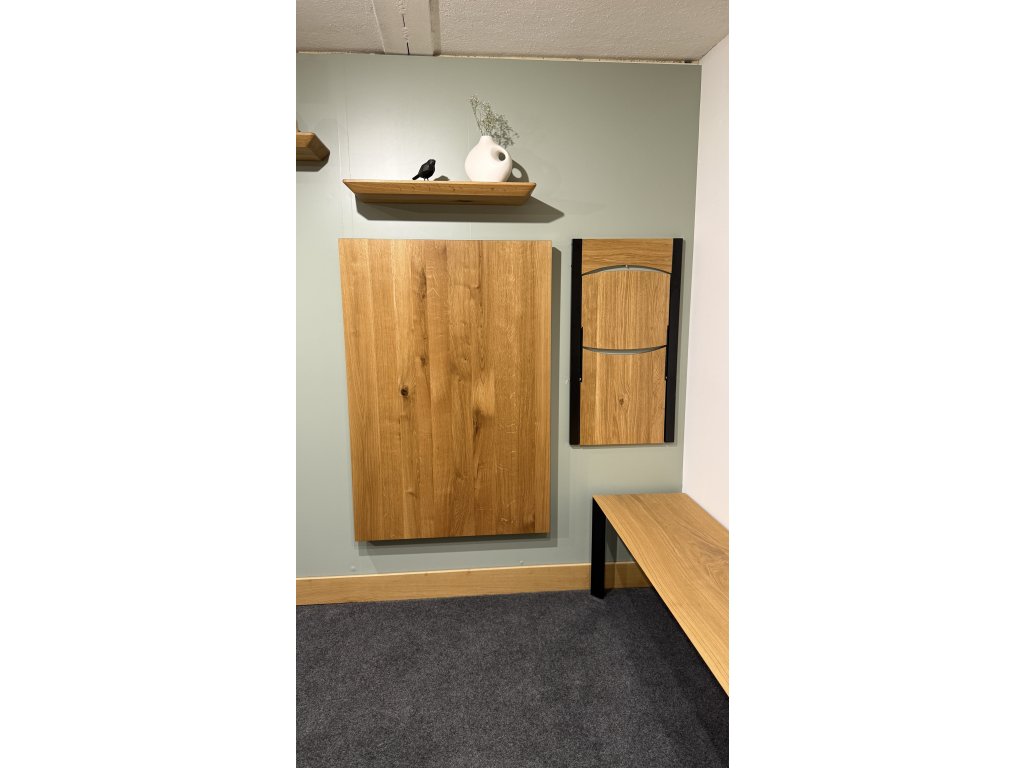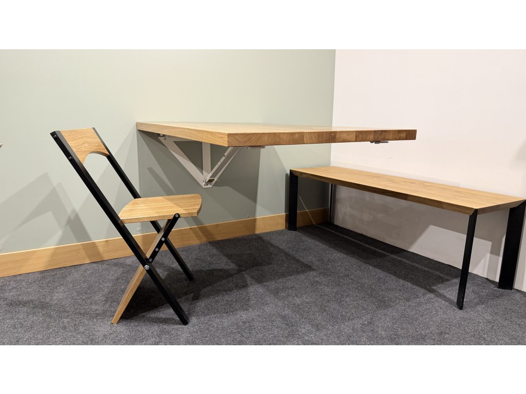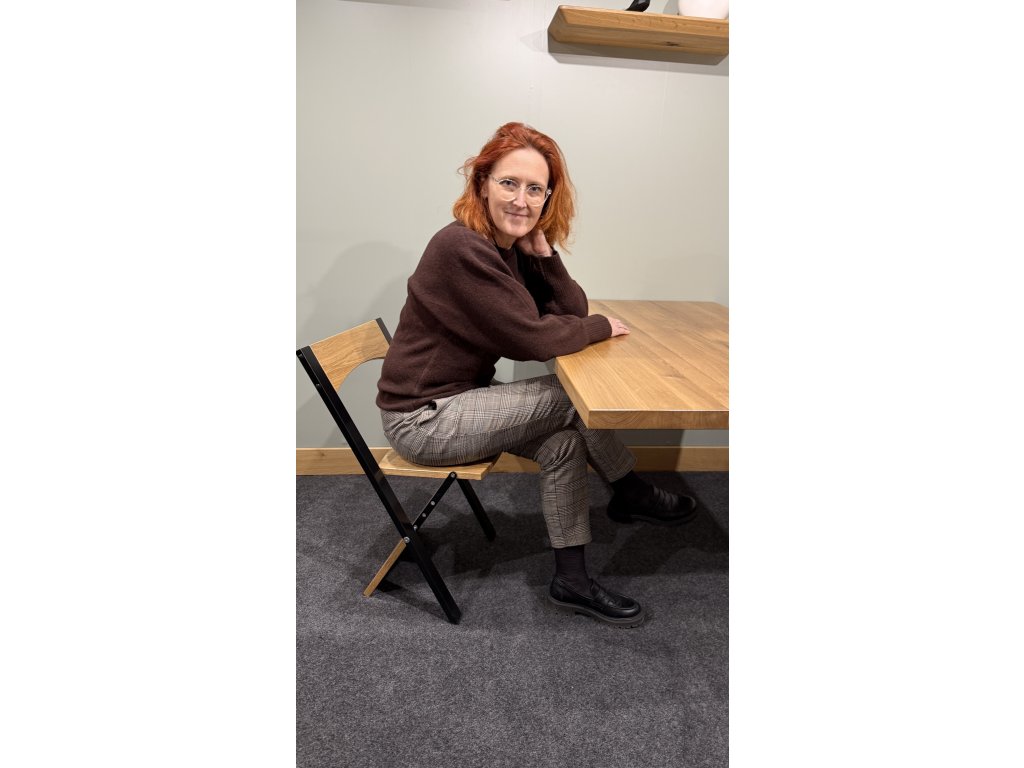 Skládací židle je skvělý parťák ke sklápěcímu stolu Kivi. Stejně jako on může být pověšená na zdi jako dřevěný obraz. Díky svému štíhlému profilu ji můžete také zasunout za skříň.