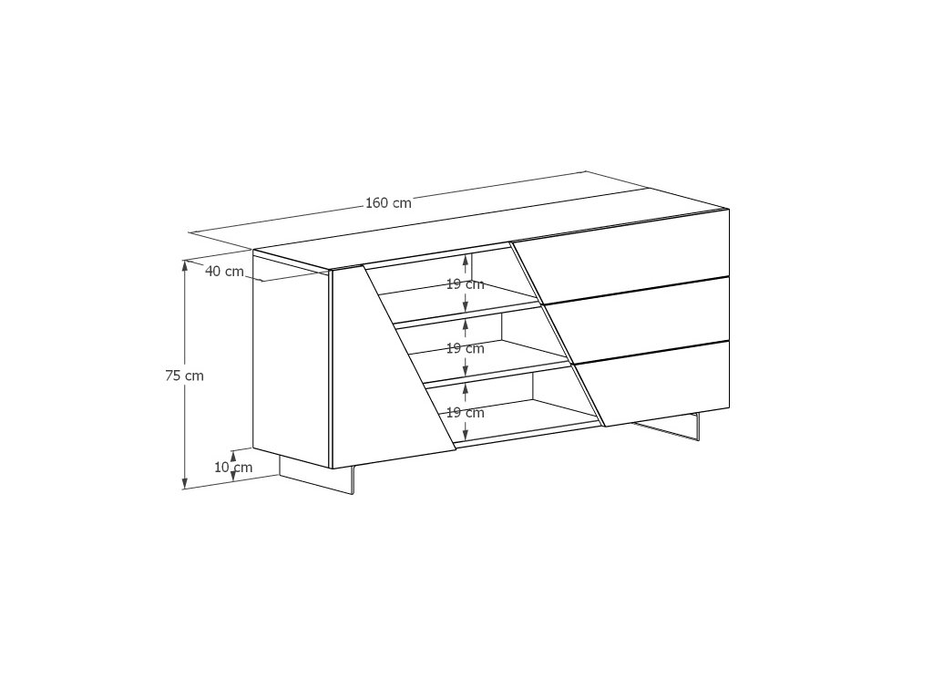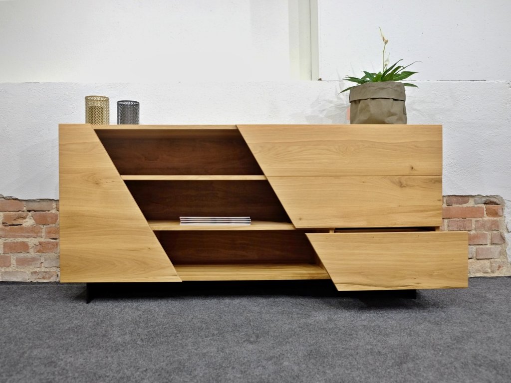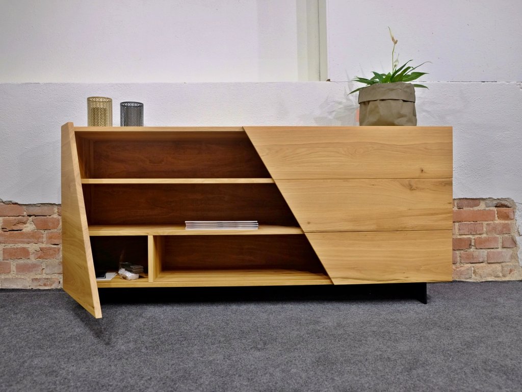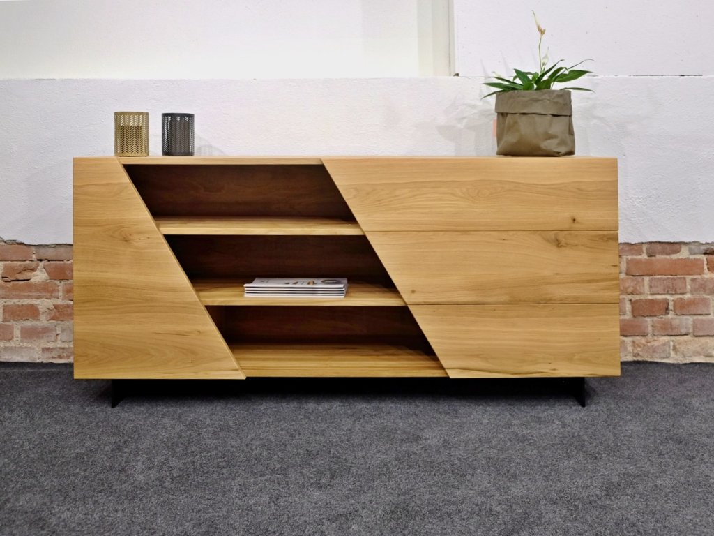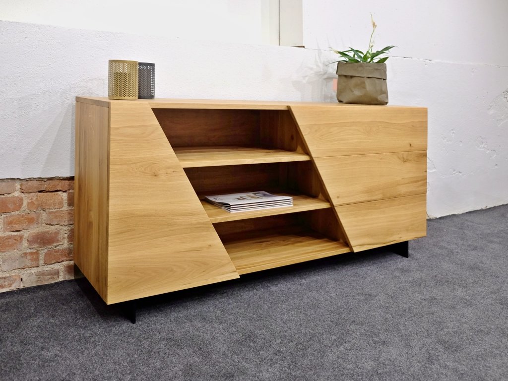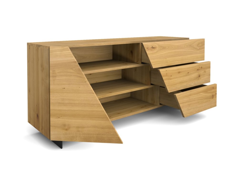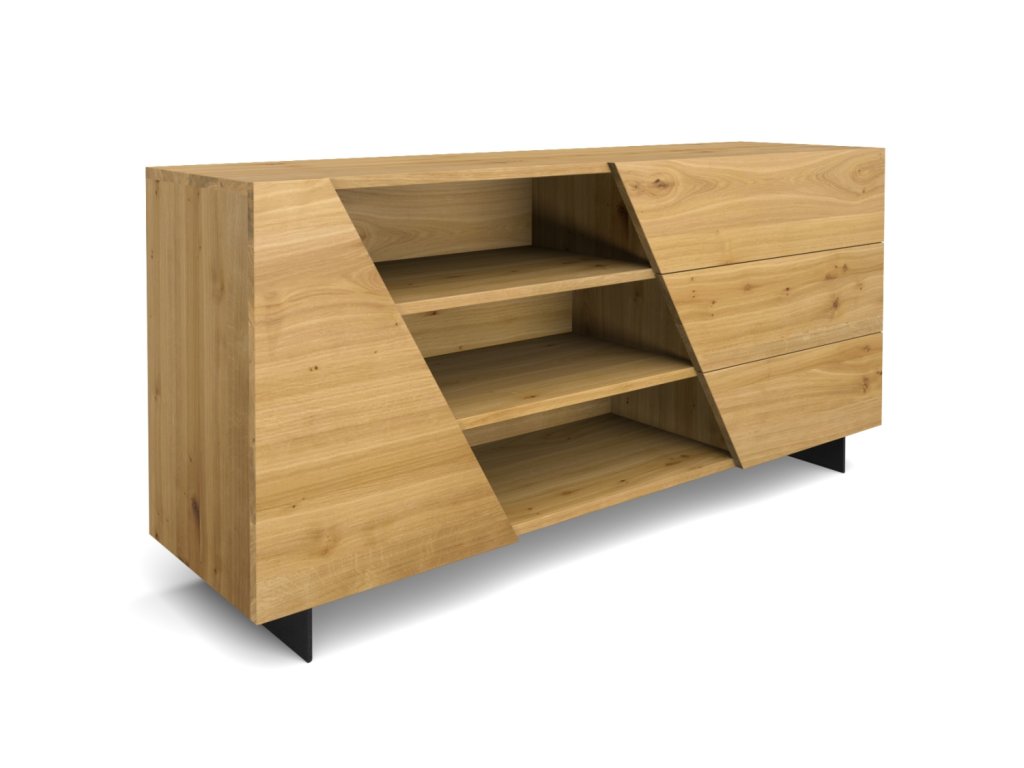 Unikátní zešikmení komodu osvěžuje a elegantně odděluje její otevřenou a uzavřenou část. Design odlehčují také tenké kovové nohy, na kterých tři patra masivního dřeva stojí.