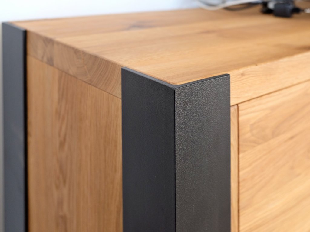 Orlí majestátnost, lokální masiv a designová čistota. Ocelové nohy zapuštěné do dřeva mají tvar písmene L, což stolku propůjčuje originální industriální vzhled. Podtrhují ho stylové úchytky a spodní kovová lišta.